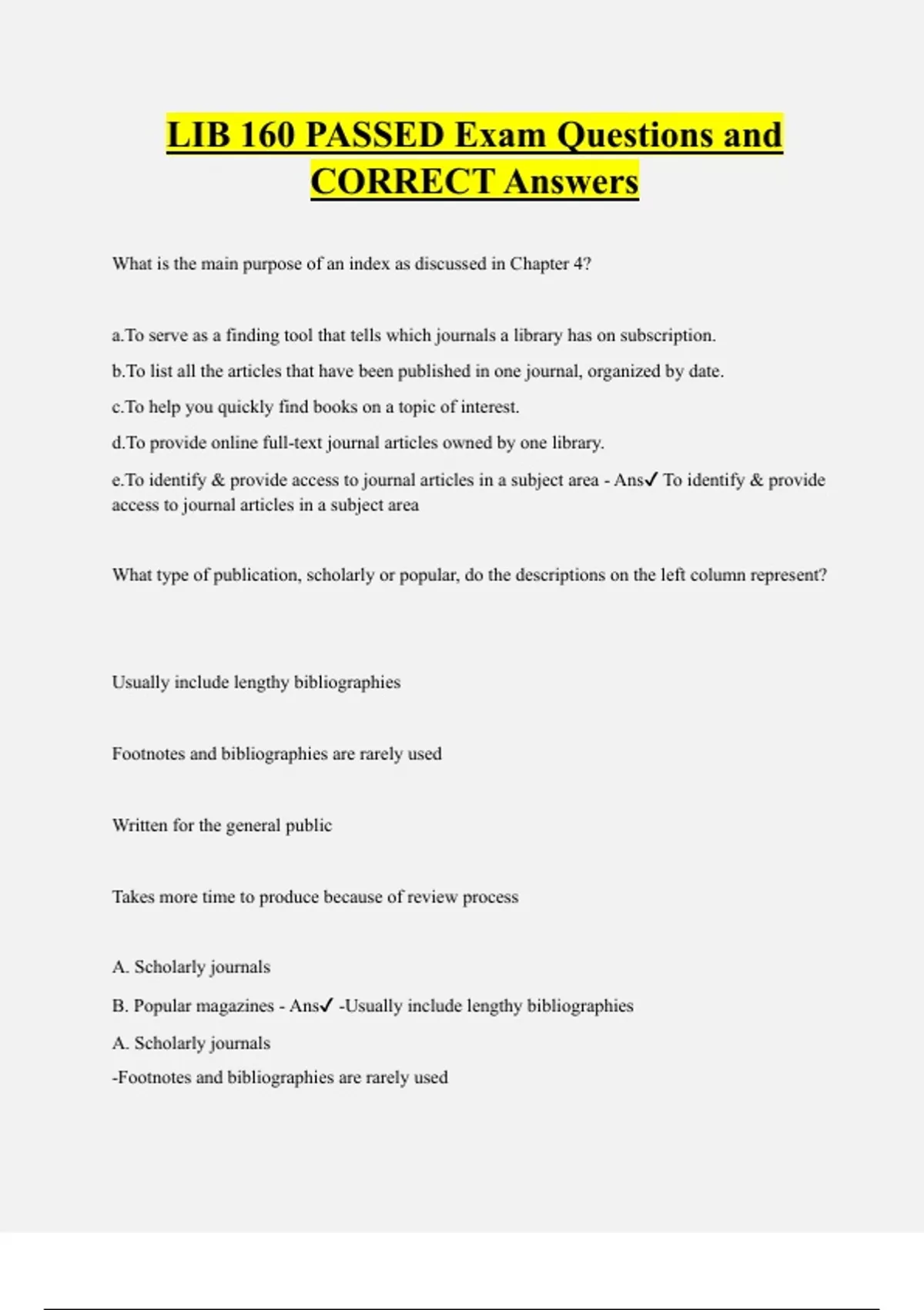 LIB 160 PASSED Exam Questions and CORRECT Answers What is the main purpose of an index as discussed in Chapter 4? a.To serve as a finding tool that tells which journals a library has on subscription. b.To list all the articles that have been published in one journal, organized by date. c.To help you quickly find books on a topic of interest. d.To provide online full-text journal articles owned by one library. e.To identify & provide access to journal articles in a subject area - Ans To identify & provide access to journal articles in a subject area