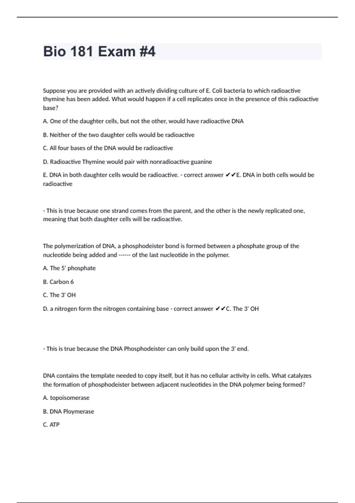 Bio 181 Exam #4Suppose you are provided with an actively dividing culture of E. Coli bacteria to which radioactive thymine has been added. What would happen if a cell replicates once in the presence of this radioactive base? A. One of the daughter cells, but not the other, would have radioactive DNA B. Neither of the two daughter cells would be radioactive C. All four bases of the DNA would be radioactive D. Radioactive Thymine would pair with nonradioactive guanine E. DNA in both daughter cells would be radioactive. - correct answer E. DNA in both cells would be radioactive - This is true because one strand comes from the parent, and the other is the newly replicated one, meaning that both daughter cells will be radioactive. The polymerization of DNA, a phosphodeister bond is formed between a phosphate group of the nucleotide being added and ------ of the last nucleotide in the polymer. A. The 5' phosphate B. Carbon 6 C. The 3' OH D. a nitrogen form the nitrogen containing base - correct answer C. The 3' OH - This is true because the DNA Phosphodeister can only build upon the 3' end. DNA contains the template needed to copy itself, but it has no cellular activity in cells. What catalyzes the formation of phosphodeister between adjacent nucleotides in the DNA polymer being formed? A. topoisomerase B. DNA Ploymerase