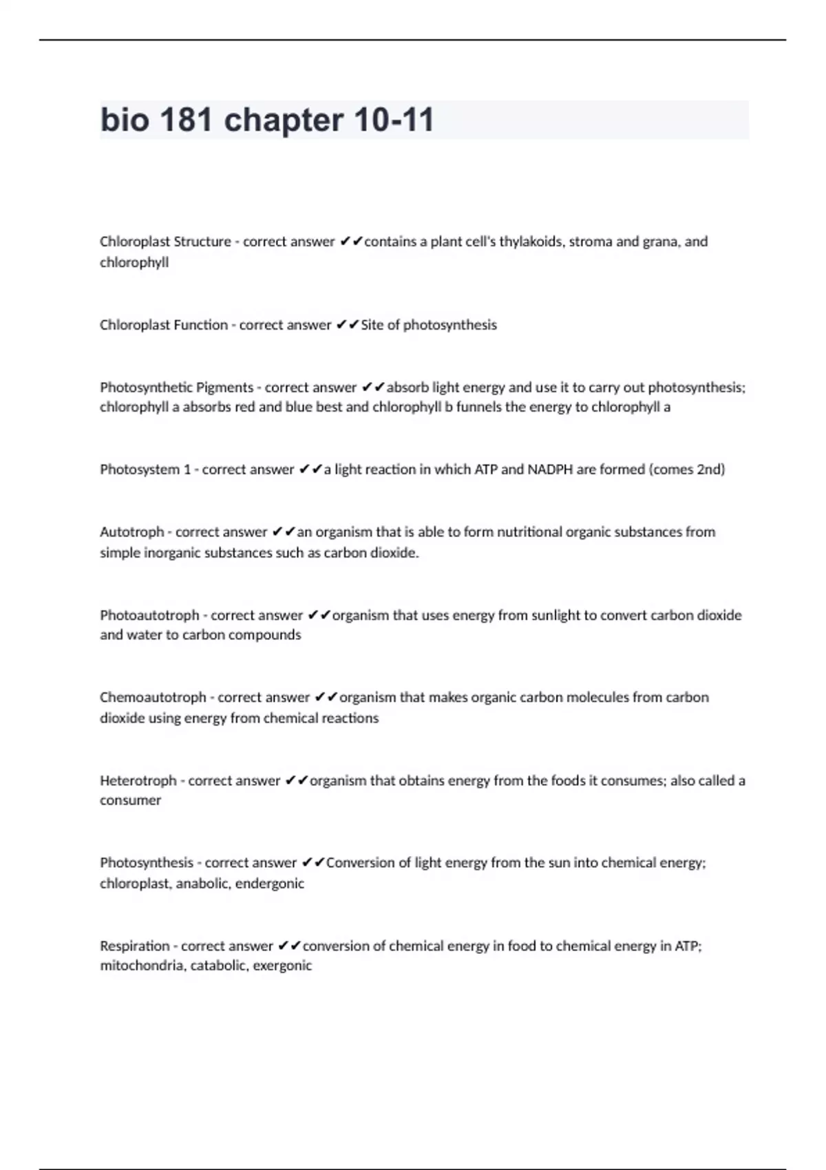 bio 181 chapter 10-11Chloroplast Structure - correct answer contains a plant cell's thylakoids, stroma and grana, and chlorophyll Chloroplast Function - correct answer Site of photosynthesis Photosynthetic Pigments - correct answer absorb light energy and use it to carry out photosynthesis; chlorophyll a absorbs red and blue best and chlorophyll b funnels the energy to chlorophyll a Photosystem 1 - correct answer a light reaction in which ATP and NADPH are formed (comes 2nd) Autotroph - correct answer an organism that is able to form nutritional organic substances from simple inorganic substances such as carbon dioxide. Photoautotroph - correct answer organism that uses energy from sunlight to convert carbon dioxide and water to carbon compounds Chemoautotroph - correct answer organism that makes organic carbon molecules from carbon dioxide using energy from chemical reactions Heterotroph - correct answer organism that obtains energy from the foods it consumes; also called a consumer Photosynthesis - correct answer Conversion of light energy from the sun into chemical energy; chloroplast, anabolic, endergonic Respiration - correct answer conversion of chemical energy in food to chemical energy in ATP; mitochondria, catabolic, exergonic