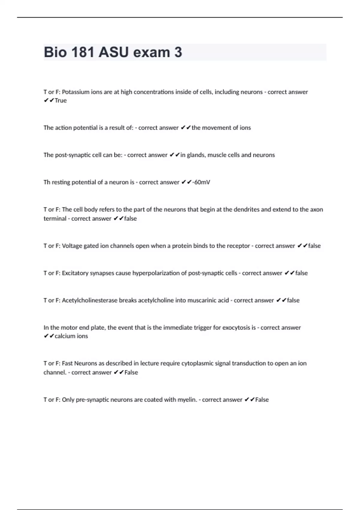 Bio 181 ASU exam 3T or F: Potassium ions are at high concentrations inside of cells, including neurons - correct answer True The action potential is a result of: - correct answer the movement of ions The post-synaptic cell can be: - correct answer in glands, muscle cells and neurons Th resting potential of a neuron is - correct answer -60mV T or F: The cell body refers to the part of the neurons that begin at the dendrites and extend to the axon terminal - correct answer false T or F: Voltage gated ion channels open when a protein binds to the receptor - correct answer false T or F: Excitatory synapses cause hyperpolarization of post-synaptic cells - correct answer false T or F: Acetylcholinesterase breaks acetylcholine into muscarinic acid - correct answer false In the motor end plate, the event that is the immediate trigger for exocytosis is - correct answer calcium ions T or F: Fast Neurons as described in lecture require cytoplasmic signal transduction to open an ion channel. - correct answer False T or F: Only pre-synaptic neurons are coated with myelin. - correct answer False