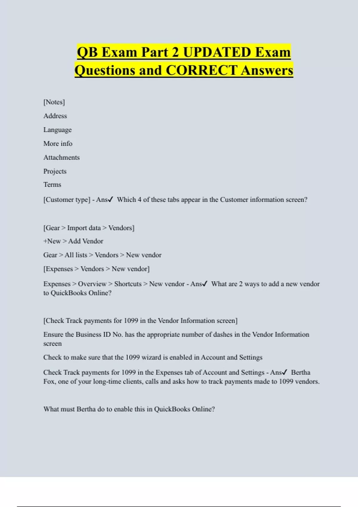 QB Exam Part 2 UPDATED Exam Questions and CORRECT Answers [Notes] Address Language More info Attachments