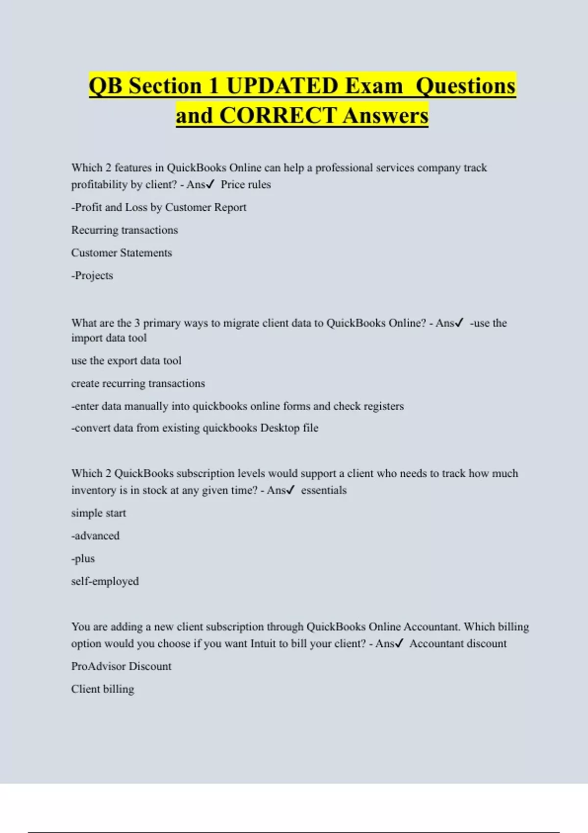 QB Section 1 UPDATED Exam Questions and CORRECT Answers Which 2 features in QuickBooks Online can help a professional services company track profitability by client? - Ans Price rules -Profit and Loss by Customer Report Recurring transactions Customer Statements -Projects