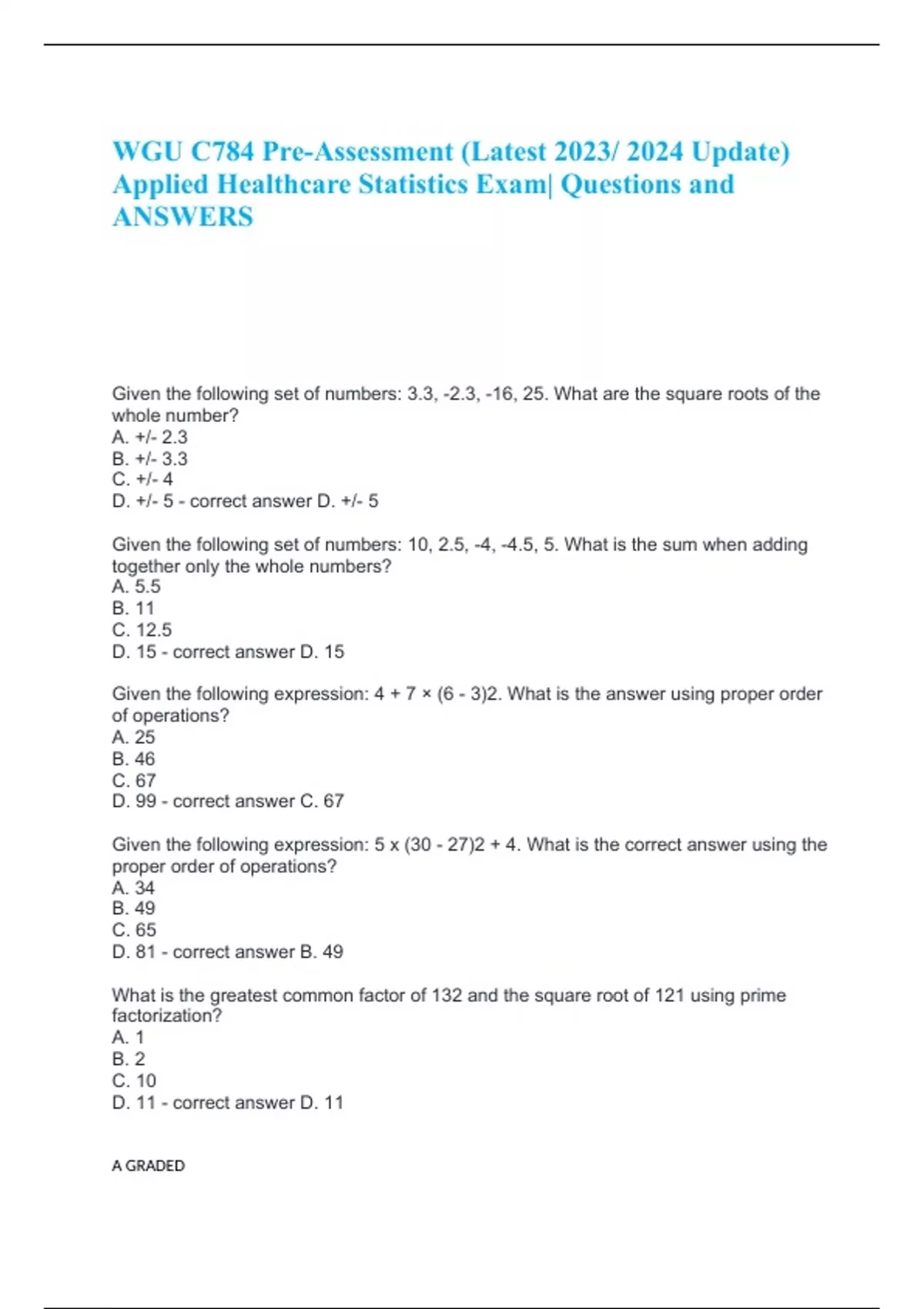 Given the following set of numbers: 3.3, -2.3, -16, 25. What are the square roots of the whole number? A. +/- 2.3 B. +/- 3.3 C. +/- 4 D. +/- 5 - correct answer D. +/- 5 Given the following set of numbers: 10, 2.5, -4, -4.5, 5. What is the sum when adding together only the whole numbers? A. 5.5 B. 11 C. 12.5 D. 15 - correct answer D. 15 Given the following expression: 4 + 7 × (6 - 3)2. What is the answer using proper order of operations? A. 25 B. 46 C. 67 D. 99 - correct answer C. 67 Given the following expression: 5 x (30 - 27)2 + 4. What is the correct answer using the proper order of operations? A. 34 B. 49 C. 65 D. 81 - correct answer B. 49 What is the greatest common factor of 132 and the square root of 121 using prime factorization? A. 1 B. 2 C. 10 D. 11 - correct answer D. 11 What is the greatest common factor of 24 and 84 using prime factorization? A. 2 B. 4 C. 8 D. 12 - correct answer D. 12 What is 3/14 - 1/7? A. 1/14 B. 2/7 C. 5/14 D. 3/2 - correct answer A. 1/14 What is 2/3 + 1/4? A. 11/12 B. 3/12 C. 3/7 D. 8/3 - correct answer A. 11/12 A patient's protein intake for today has been 15.76g, 8.49g, and 22.58g. What is the total protein intake rounded to the nearest tenth of a decimal? A. 46.5g B. 46.8g C. 46.9g D. 47g - correct answer B. 46.8g Given the equation: (.5475 - .3025) x .15. What is the solution rounded to the nearest thousandth? A. .03675 B. .0368 C. .368 D. .037 - correct answer D. .037 An intravenous drip is infused at a rate of 4.5 milliliters per minute. How many milliliters are infused per hour? A. .075mL B. 2.7mL C. 75mL D. 270mL - correct answer D. 270mL A patient's medication was increased by 40 milligrams. What is the percent increase in the medication if the original medication was 180 milligrams? A. 2.2% B. 4.5% C. 22.2% D. 45% - correct answer C. 22.2%