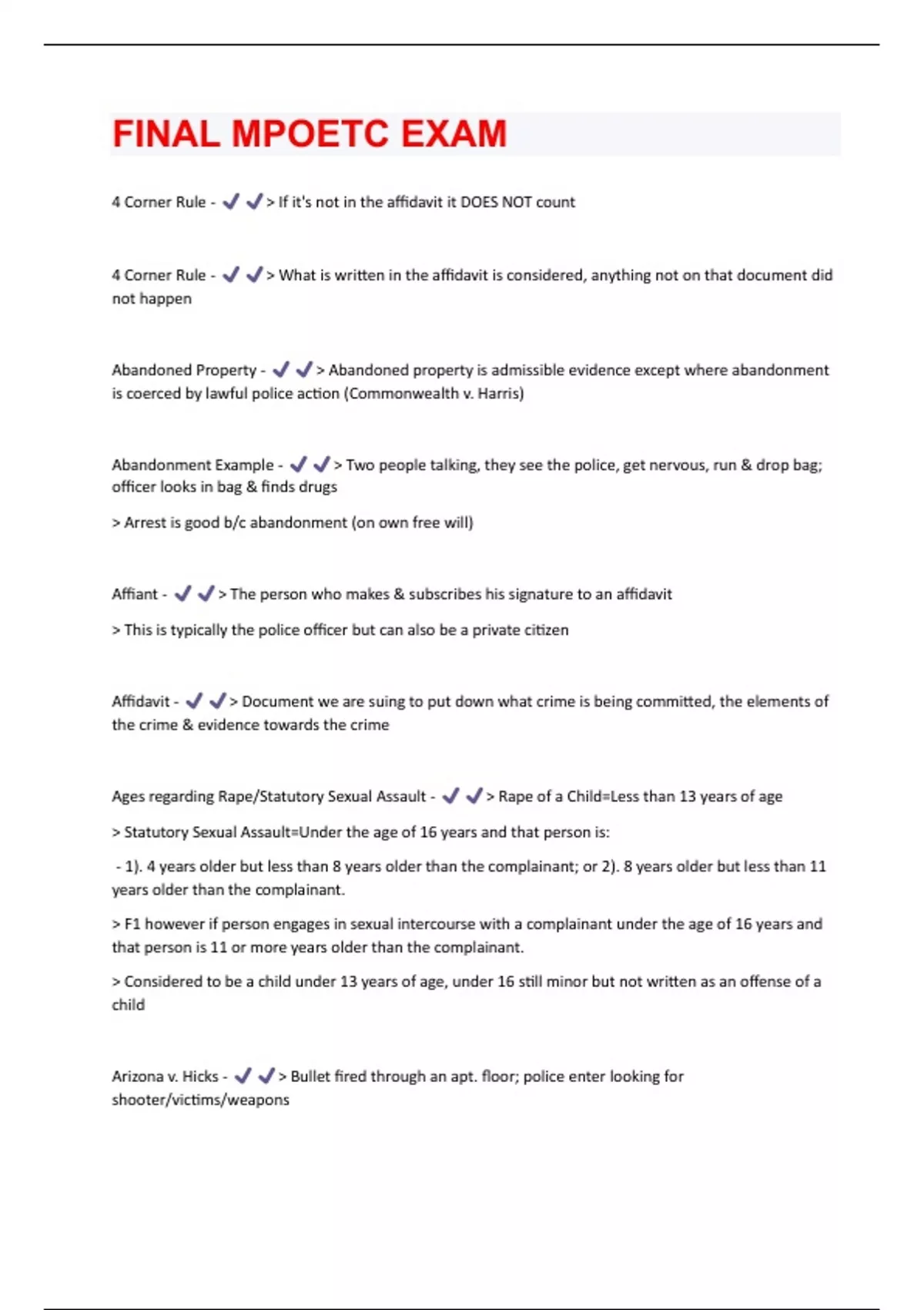 4 Corner Rule - > If it's not in the affidavit it DOES NOT count 4 Corner Rule - > What is written in the affidavit is considered, anything not on that document did not happen Abandoned Property - > Abandoned property is admissible evidence except where abandonment is coerced by lawful police action (Commonwealth v. Harris) Abandonment Example - > Two people talking, they see the police, get nervous, run & drop bag; officer looks in bag & finds drugs > Arrest is good b/c abandonment (on own free will) Affiant - > The person who makes & subscribes his signature to an affidavit > This is typically the police officer but can also be a private citizen Affidavit - > Document we are suing to put down what crime is being committed, the elements of the crime & evidence towards the crime Ages regarding Rape/Statutory Sexual Assault - > Rape of a Child=Less than 13 years of age > Statutory Sexual Assault=Under the age of 16 years and that person is: - 1). 4 years older but less than 8 years older than the complainant; or 2). 8 years older but less than 11 years older than the complainant. > F1 however if person engages in sexual intercourse with a complainant under the age of 16 years and that person is 11 or more years older than the complainant. > Considered to be a child under 13 years of age, under 16 still minor but not written as an offense of a child Arizona v. Hicks - > Bullet fired through an apt. floor; police enter looking for shooter/victims/weapons> They seize weapons & then notice stereo equipment, wrote down serial numbers > Held that the 4th Amendment requires the police to have probable cause to seize items in plain view > Exigent circumstances ended when weapons were seized, so stereo equipment is out (needed a warrant & independent PC) > Plain view doctrine violated, wasn't immediately apparent status of item as stolen Arraignment - > To inform the accused of the charges brought against him > Defendant is not entitled to present a defense at this time; no defense, not a hearing, just the charges Arraignment vs Preliminary Hearing - > Arraignment: notify defendant of the charges; no defense allowed > Preliminary Hearing: prima facie or evidence presented Arrest Defined - > The taking of a person into custody by lawful authority. A reasonable impression is conveyed to the person being arrested that he/she is under arrest. Under the WILL+CONTROL of the officer for purposes of arrest > An officer who says nothing may still convey an impre