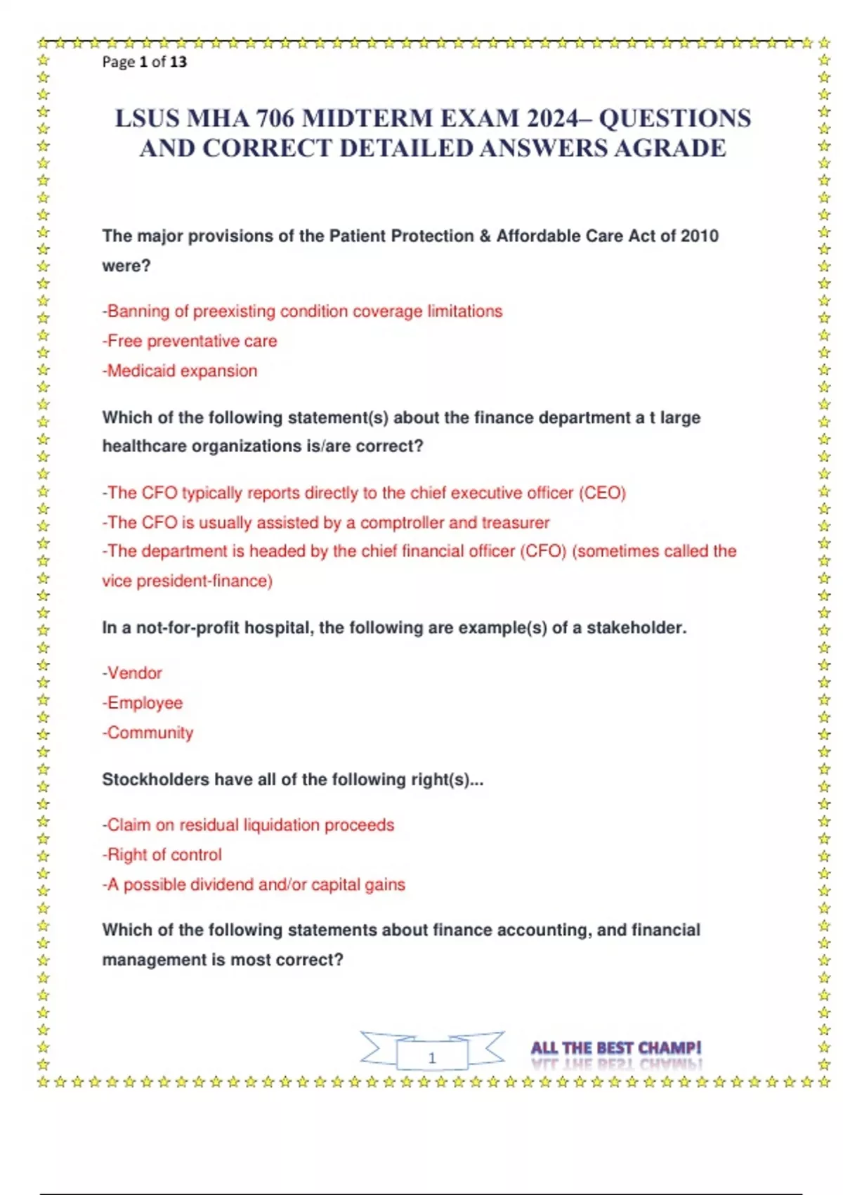 LSUS MHA 706 FINAL AND MIDTERM EXAM 2024 FINANCIAL MANAGEMENT MIDTERM ALL QUESTIONS AND CORRECT ANSWERS ALREADY GRADED A+ PROFESSOR VERIFIED