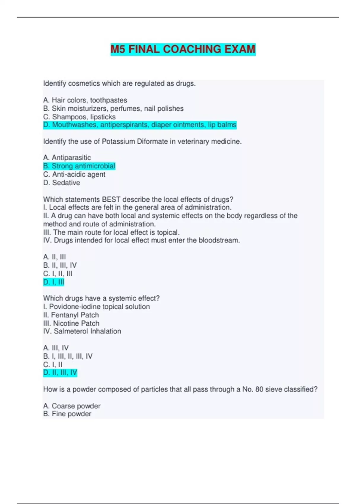 M5 FINAL COACHING EXAM - Questions and Answers (Complete Solutions) Identify cosmetics which are regulated as drugs. A. Hair colors, toothpastes B. Skin moisturizers, perfumes, nail polishes C. Shampoos, lipsticks D. Mouthwashes, antiperspirants, diaper ointments, lip balms Identify the use of Potassium Diformate in veterinary medicine. A. Antiparasitic B. Strong antimicrobial C. Anti-acidic agent D. Sedative Which statements BEST describe the local effects of drugs? I. Local effects are felt in the general area of administration. II. A drug can have both local and systemic effects on the body regardless of the method and route of administration. III. The main route for local effect is topical. IV. Drugs intended for local effect must enter the bloodstream. A. II, III B. II, III, IV C. I, II, III D. I, III Which drugs have a systemic effect? I. Povidone-iodine topical solution II. Fentanyl Patch III. Nicotine Patch IV. Salmeterol Inhalation A. III, IV B. I, III, II, III, IV C. I, II D. II, III, IV How is a powder composed of particles that all pass through a No. 80 sieve classified? A. Coarse powder B. Fine powder C. Very fine powder D. Very coarse powder Analyze which method of preparing powders may be employed both to comminute and mix the ingredients; for comminution purposes, a porcelain or Wedgewood mortar with a rough inner surface is preferred; and for chemicals that may stain the porcelain or Wedgewood surface, a glass mortar is preferred. A. Mechanical mixing B. Sifting C. Trituration D. Tumbling Identify the method of preparing powders that consists of enclosing the powder in a large container, which rotates and mixes the powder ingredients. A. Sifting B. Tumbling C. Trituration D. Mechanical mixing The following are the advantages of granules over powders, EXCEPT A. Better flow property B. Not easily wetted by liquids C. More stable to humidity D. less tendency to cake or harden Analyze and select the basic product formulation for a tablet. A. Active ingredient, diluent, lubricant B. Active ingredient, solvent, emulsifier, lubricant C. Active ingredient, solubilizing agent, binder, disintegrant, filler D. Active ingredient, diluent or filler, binder, disintegrant, lubricant Classify tablets that are prepared by compressing granular materials that have the capacity to release gas when in contact with water A. Buccal tablets B. Effervescent tablets C. Enteric-coated tablets D. Multiple-compressed tablets Opacifying agent used in the preparation of hard gelatin capsules A. Zinc oxide B. Titanium dioxide C. Sulfur dioxide D. Silicon dioxide Evaluate which statements are correct regarding hard and soft gelatin capsules. I. Aside from gelatin, two-piece capsules may also be prepared from HPMC and starches. (Vegetable capsules) II. If stored in an environment of high humidity, hard gelatin capsules may become distorted and lose their rigid shape. III. Soft gelatin capsules are made of gelatin to which glycerin or sorbitol has been added. IV. Soft gelatin capsules are used to encapsulate and hermetically seal non-aqueous liquids. A. I, III B. II, IV C. I, III, IV D. I, II, III, IV Analyze which drug delivery system achieves slow release of drug over an extended period of time. A. Site-specific release B. Delayed release C. Receptor release D. Sustained release Select the delivery system, which does NOT produce or maintain uniform drug blood levels within the therapeutic range but is more effective for patient compliance than conventional dosage forms. A. Site-specific release B. Receptor release C. Sustained release D. Delayed release Evaluate which statement is correct regarding rectal administration of drugs. A. The primary advantage of using rectal route is that it completely avoids the first-pass effect. B. The downside of rectal administration includes the stigma of violating the patient's dignity. C. Adult rectal suppositories weigh about 5 g when cocoa butter is employed as the base. D. Rectal suppositories for use by infants and children are about twice the weight and size of the adult suppositories. Determine which is NOT a good characteristic of a suppository base. A. Compatible with a variety of drugs B. Remains stable in rectal fluids C. Stable on storage D. Nontoxic and nonirritating to the mucous membranes Find the incorrect statement about Theobroma Oil. A. It is a naturally occurring alkaloid. B. The alpha form is metastable with a melting point below 30 °C. C. The beta crystal is its stable form with a melting point approaching 35 °C. D. It requires a fusion temperature of 40-50 °C to prevent a change in crystal form and melting point. Find the incorrect statement about Oleaginous Ointment Bases/ Hydrocarbon bases. A. They include fixed oils of vegetable origin, fats from animals and semisolid HC obtained from petroleum. B. Oleaginous ointment bases are excellent emollients. C. Vegetable oils and animal fats have a lower water absorbing capacity. D. Vegetable oils raise the melting point of ointments. Which of the following are used as ointment bases? I. Lanolin II. Mineral oil/ Liquid petrolatum III. Petrolatum IV. Glycerin V. Coconut oil A. I, II B. II. V C. I, III D. III, IV Classify White Petrolatum as an ointment base. A. Hydrocarbon base B. Absorption base C. Emulsion base (o/w type) D. Emulsion base (w/o type) Classify Anhydrous Lanolin as an ointment base. A. Emulsion base (o/w type) B. Emulsion base (w/o type) C. Absorption base D. Water-soluble base Classify Olive Oil as an ointment base. A. Absorption bases B. Vegetable oil bases C. Hydrocarbon bases D. Emulsifying bases Classify Polyethylene Glycol as an ointment base. A. Hydrocarbon bases B. Emulsifying bases C. Water absorbable bases D. Absorption bases Classify pectin paste, tragacanth jelly, bentonite gel, and colloidal magnesium aluminum silicate gels as semisolid base. A. Emulsifiable base B. Emulsified base C. Hydrogel D. Organogel Classify aluminum stearate, mineral oil gel, and theobroma oil as