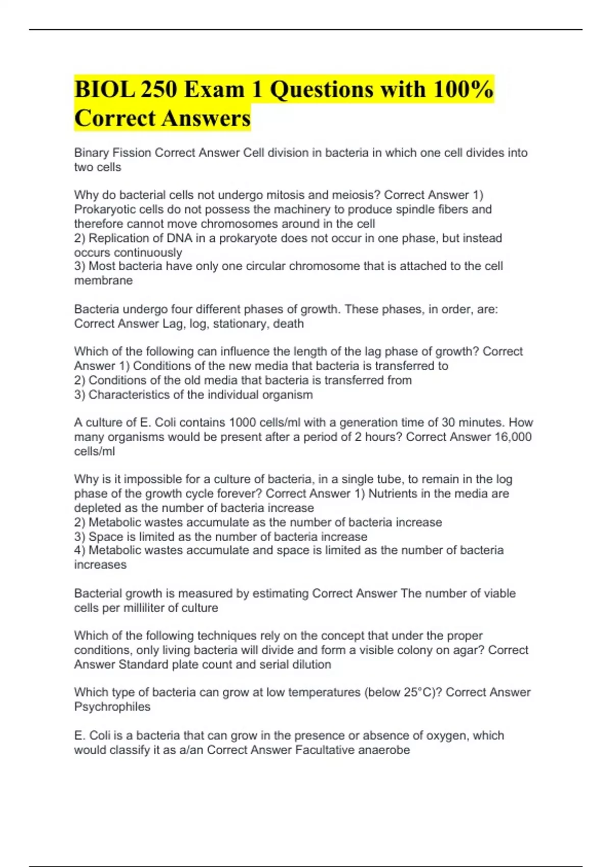 Binary Fission Correct Answer Cell division in bacteria in which one cell divides into two cells Why do bacterial cells not undergo mitosis and meiosis? Correct Answer 1) Prokaryotic cells do not possess the machinery to produce spindle fibers and therefore cannot move chromosomes around in the cell 2) Replication of DNA in a prokaryote does not occur in one phase, but instead occurs continuously 3) Most bacteria have only one circular chromosome that is attached to the cell membrane Bacteria undergo four different phases of growth. These phases, in order, are: Correct Answer Lag, log, stationary, death Which of the following can influence the length of the lag phase of growth? Correct Answer 1) Conditions of the new media that bacteria is transferred to 2) Conditions of the old media that bacteria is transferred from 3) Characteristics of the individual organism A culture of E. Coli contains 1000 cells/ml with a generation time of 30 minutes. How many organisms would be present after a period of 2 hours? Correct Answer 16,000 cells/ml Why is it impossible for a culture of bacteria, in a single tube, to remain in the log phase of the growth cycle forever? Correct Answer 1) Nutrients in the media are depleted as the number of bacteria increase 2) Metabolic wastes accumulate as the number of bacteria increase 3) Space is limited as the number of bacteria increase 4) Metabolic wastes accumulate and space is limited as the number of bacteria increases Bacterial growth is measured by estimating Correct Answer The number of viable cells per milliliter of culture Which of the following techniques rely on the concept that under the proper conditions, only living bacteria will divide and form a visible colony on agar? Correct Answer Standard plate count and serial dilution Which type of bacteria can grow at low temperatures (below 25°C)? Correct Answer Psychrophiles E. Coli is a bacteria that can grow in the presence or absence of oxygen, which would classify it as a/an Correct Answer Facultative anaerobe