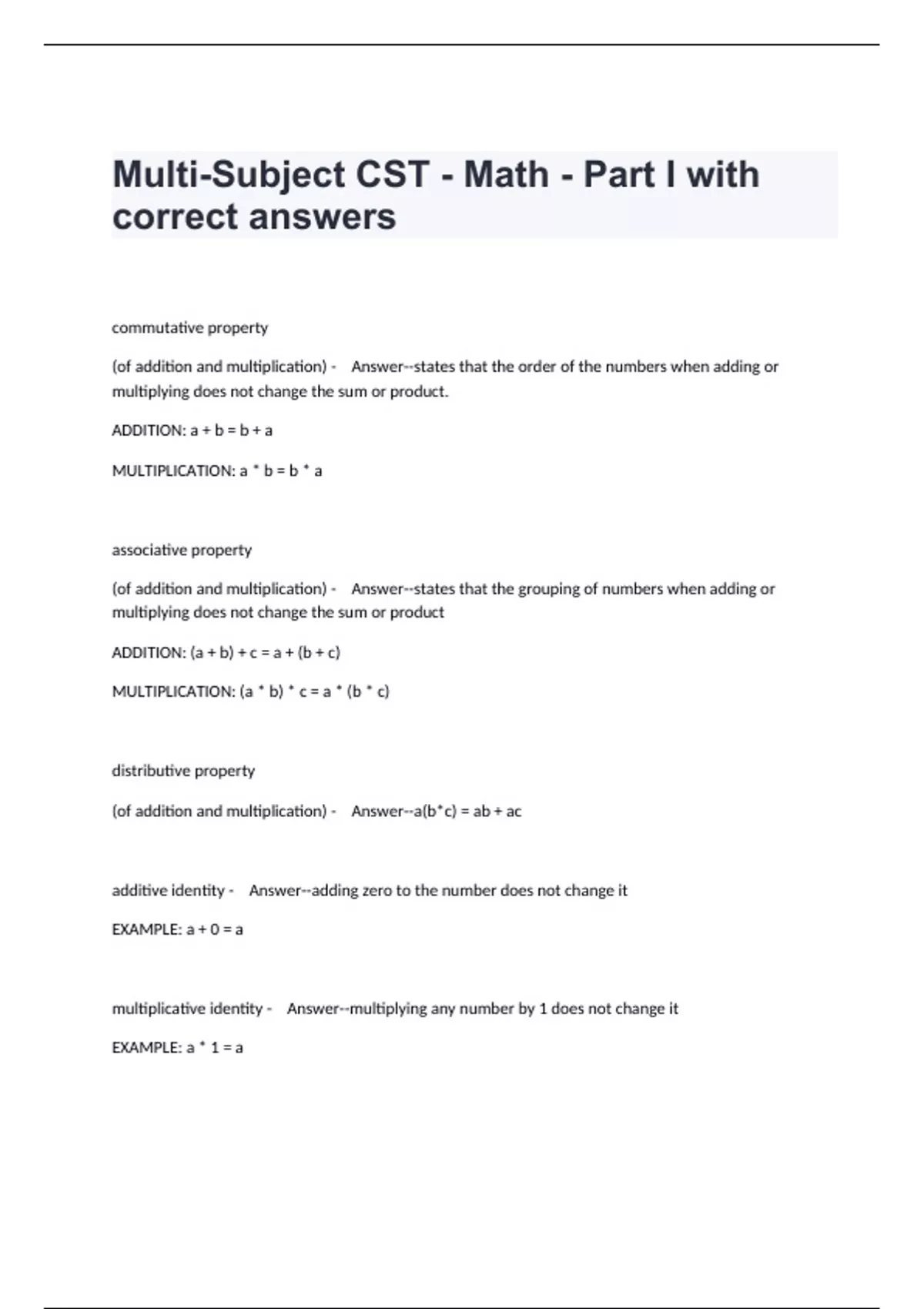 Multi-Subject CST - Math - Part I with correct answers
