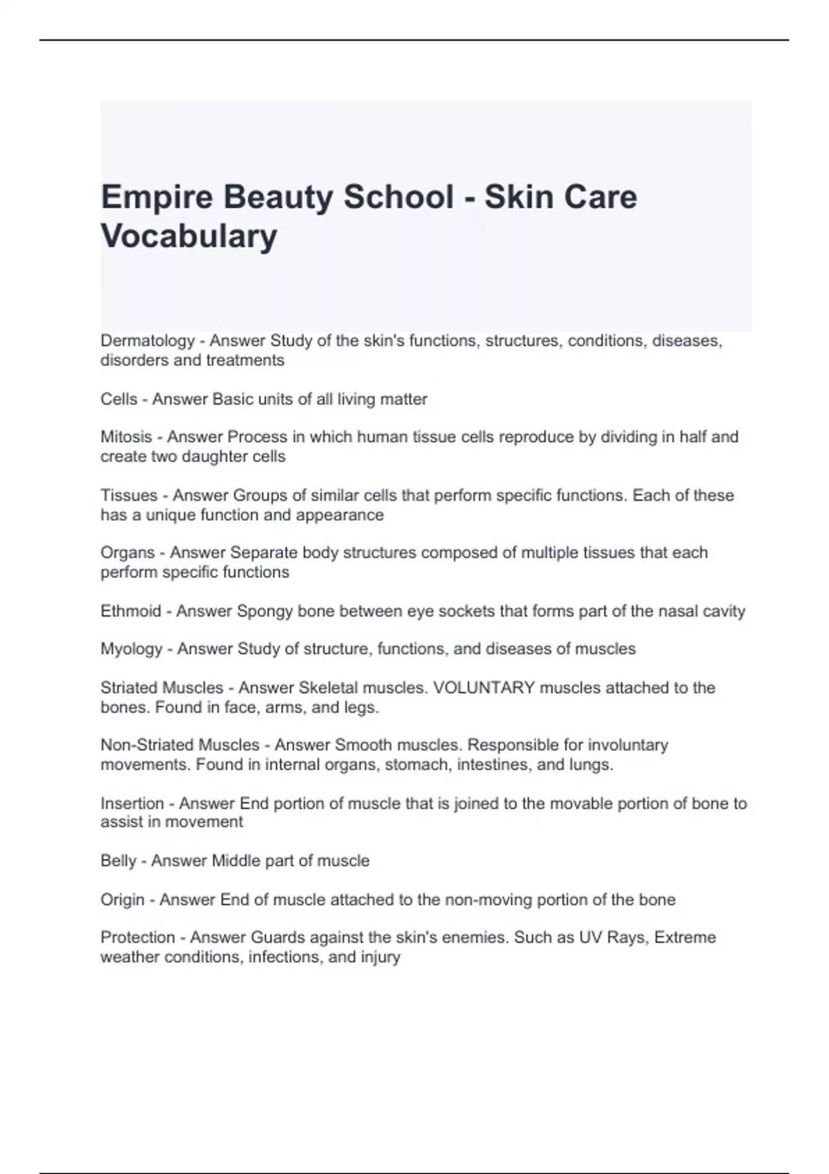 Empire Beauty School - Skin Care Vocabulary Exam Questions and Answers