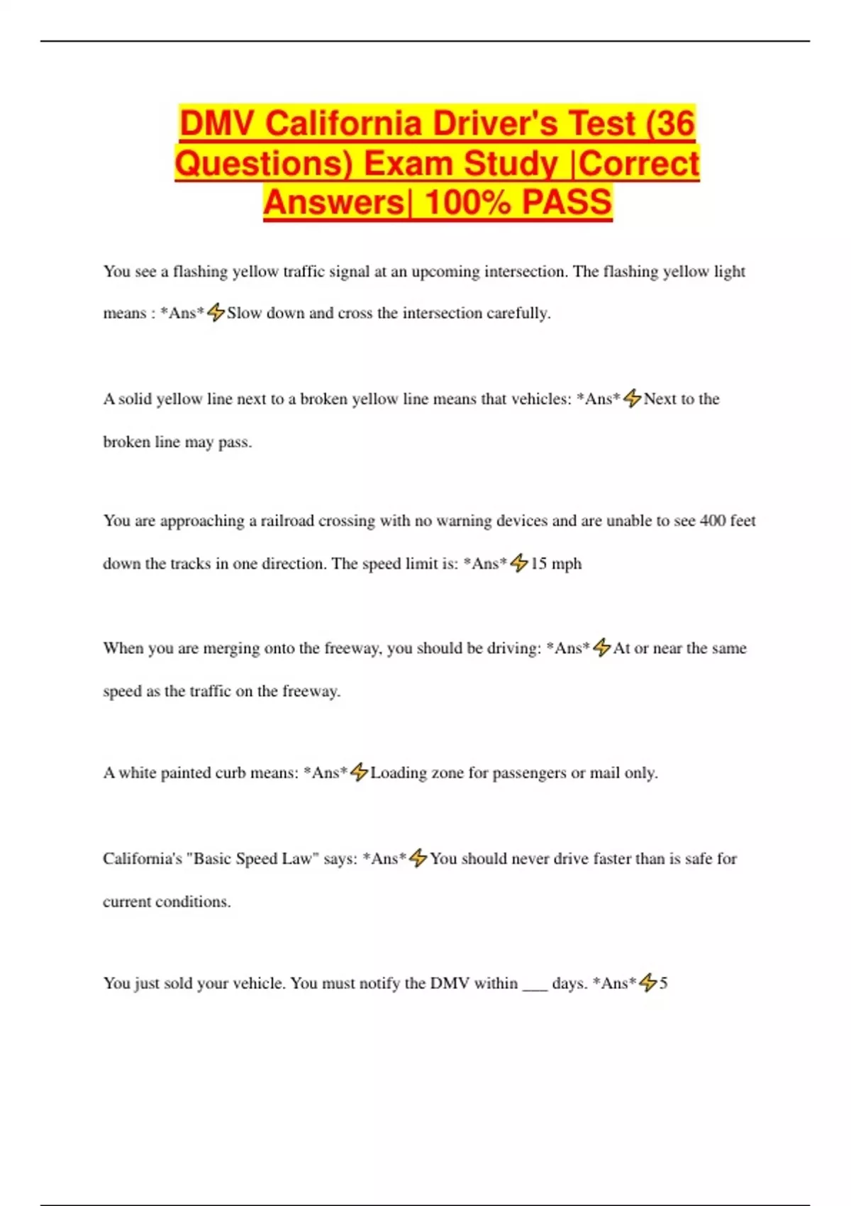 DMV California Driver's Test (36 Questions) Exam Study |Correct Answers| 100% PASS