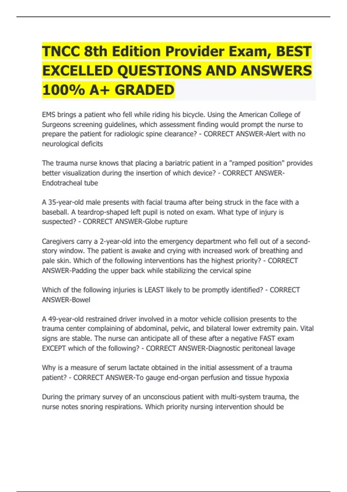 TNCC 8th Edition Provider Exam, BEST EXCELLED QUESTIONS AND ANSWERS 100% A+ GRADED