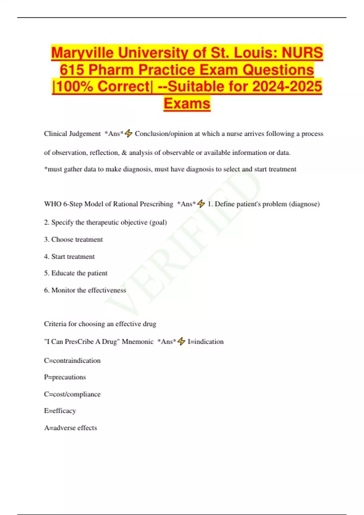 Maryville University of St. Louis: NURS 615 Pharm Practice Exam Questions |100% Correct| --Suitable for Exams Clinical Judgement *Ans* Conclusion/opinion at which a nurse arrives following a process of observation, reflection, & analysis of observable or available information or data. *must gather data to make diagnosis, must have diagnosis to select and start treatment WHO 6-Step Model of Rational Prescribing *Ans* 1. Define patient's problem (diagnose) 2. Specify the therapeutic objective (goal) 3. Choose treatment 4. Start treatment 5. Educate the patient 6. Monitor the effectiveness Criteria for choosing an effective drug "I Can PresCribe A Drug" Mnemonic *Ans* I=indication C=contraindication P=precautions C=cost/compliance E=efficacy A=adverse effects D=dose/duration/direction Role of FDA *Ans* Ensures the safety, efficacy, and security of human and veterinary drugs, biological products, and medical devices. As well as food, cosmetics, and products that emit radiation. What is the role of the FDA in regard to supplements and vitamins? *Ans* Does NOT protect or ensure the safety of supplements and vitamins. They have certain rules, but they aren't as stringent like they are for drugs. What can St. John's wort interact with? *Ans* SSRI, CNS drugs, MAOI, SSNRI, steroids, caffeine, and anticoagulants. Off-label prescribing *Ans* medication is being used in a manner not specified in the FDAs approved packaging label/insert. *different route, dose, or indication Pharmacotherapeutics *Ans* study of therapeutic uses and effects of drugs. Beneficial and adverse drug reactions. Pharmacodynamics *Ans* what the drug does to the body Agonist *Ans* binds to a receptor & produces a response/stimulates (full activation) Antagonist *Ans* Binds & blocks activity (no activation