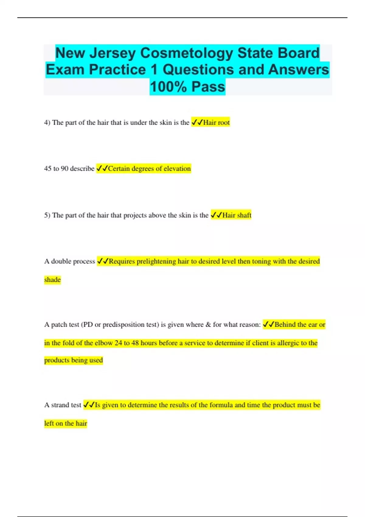 New Jersey Cosmetology State Board Exam Practice 1 Questions and Answers 100% Pass 4) The part of the hair that is under the skin is the Hair root 45 to 90 describe Certain degrees of elevation 5) The part of the hair that projects above the skin is the Hair shaft A double process Requires prelightening hair to desired level then toning with the desired shade A patch test (PD or predisposition test) is given where & for what reason: Behind the ear or in the fold of the elbow 24 to 48 hours before a service to determine if client is allergic to the products being used A strand test Is given to determine the results of the formula and time the product must be left on the hair A warm towel on the skin Opens pores After using an emery board on a client what should be done with it? Thrown away 1) Who is in charge of Universal Precautions? OSHA 2) Who oversees the board of Cosmetology and Hairstyling? Division of Consumer Affairs; Department of Law & Safety 3) After a depilatory or an epilator what can be used to clean up any remaining hairs? Tweezers An example of a vegetable tint is Henna Before a relaxer service you must check the scalp for Abrasions Brushing 2 pincurls to connect them is called Backbrushing Exothermic perms do not require An outside heat source How do you apply a virgin application of a relaxer? 1/2 inch away from scalp to 1/2 inch before porous ends How do you apply styptic powder? With a disposable tool. How do you file for a manicure? From outer