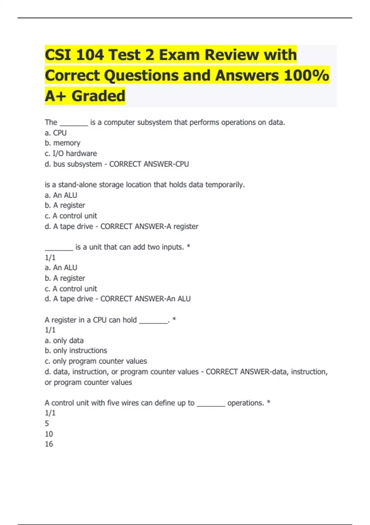 CSI 104 Test 2 Exam Review with Correct Questions and Answers 100% A+ Graded The _______ is a computer subsystem that performs operations on data. a. CPU b. memory c. I/O hardware d. bus subsystem - CORRECT ANSWER-CPU is a stand-alone storage location that holds data temporarily. a. An ALU b. A register c. A control unit d. A tape drive - CORRECT ANSWER-A register _______ is a unit that can add two inputs. * 1/1 a. An ALU b. A register c. A control unit d. A tape drive - CORRECT ANSWER-An ALU A register in a CPU can hold _______. * 1/1 a. only data b. only instructions c. only program counter values d. data, instruction, or program counter values - CORRECT ANSWER-data, instruction, or program counter values A control unit with five wires can define up to _______ operations. * 1/1 5 10 16