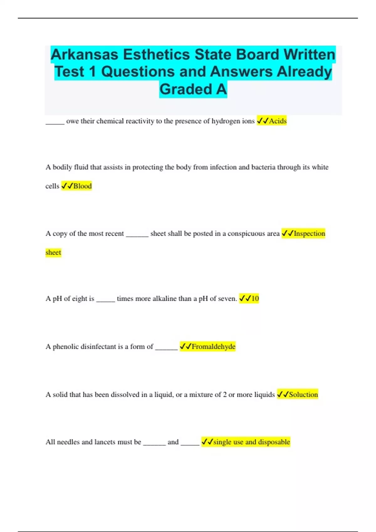 Arkansas Esthetics State Board Written Test 1 Questions and Answers Already Graded A _____ owe their chemical reactivity to the presence of hydrogen ions Acids A bodily fluid that assists in protecting the body from infection and bacteria through its white cells Blood A copy of the most recent ______ sheet shall be posted in a conspicuous area Inspection sheet A pH of eight is _____ times more alkaline than a pH of seven. 10 A phenolic disinfectant is a form of ______ Fromaldehyde A solid that has been dissolved in a liquid, or a mixture of 2 or more liquids Soluction All needles and lancets must be ______ and _____ single use and disposable An active agent used to remove oil from the hair Surfactant Are roll on wax applicators permitted? NO Can an inspector require your ID? Yes Can you display an expired license? No Carpet cannot be in your ________ Working area Certification of department records cost $50 per license Change of name and/or ownership change of a SCHOOL fee $500 one time fee Cosmetic Any product used for beautifying the skin Cosmetology establishments are inspected at least ______, but are not limited to Annually Define clean Removal of visible debris