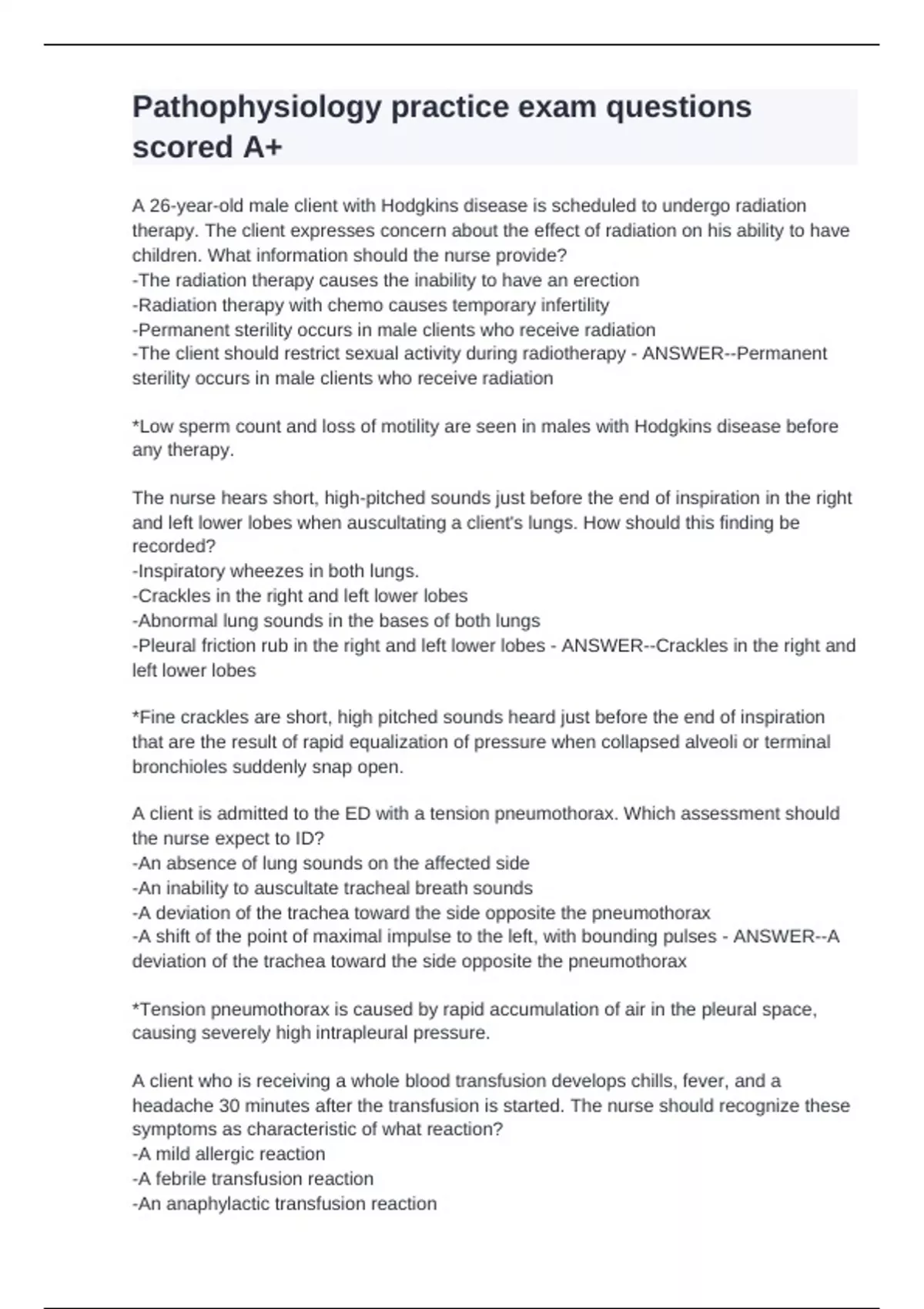 A 26-year-old male client with Hodgkins disease is scheduled to undergo radiation therapy. The client expresses concern about the effect of radiation on his ability to have children. What information should the nurse provide? -The radiation therapy causes the inability to have an erection -Radiation therapy with chemo causes temporary infertility -Permanent sterility occurs in male clients who receive radiation -The client should restrict sexual activity during radiotherapy - ANSWER--Permanent sterility occurs in male clients who receive radiation *Low sperm count and loss of motility are seen in males with Hodgkins disease before any therapy. The nurse hears short, high-pitched sounds just before the end of inspiration in the right and left lower lobes when auscultating a client's lungs. How should this finding be recorded? -Inspiratory wheezes in both lungs. -Crackles in the right and left lower lobes -Abnormal lung sounds in the bases of both lungs -Pleural friction rub in the right and left lower lobes - ANSWER--Crackles in the right and left lower lobes *Fine crackles are short, high pitched sounds heard just before the end of inspiration that are the result of rapid equalization of pressure when collapsed alveoli or terminal bronchioles suddenly snap open. A client is admitted to the ED with a tension pneumothorax. Which assessment should the nurse expect to ID? -An absence of lung sounds on the affected side -An inability to auscultate tracheal breath sounds -A deviation of the trachea toward the side opposite the pneumothorax -A shift of the point of maximal impulse to the left, with bounding pulses - ANSWER--A deviation of the trachea toward the side opposite the pneumothorax *Tension pneumothorax is caused by rapid accumulation of air in the pleural space, causing severely high intrapleural pressure. A client who is receiving a whole blood transfusion develops chills, fever, and a headache 30 minutes after the transfusion is started. The nurse should recognize these symptoms as characteristic of what reaction? -A mild allergic reaction -A febrile transfusion reaction