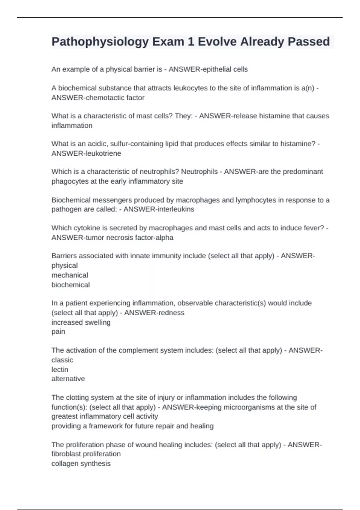 An example of a physical barrier is - ANSWER-epithelial cells A biochemical substance that attracts leukocytes to the site of inflammation is a(n) - ANSWER-chemotactic factor What is a characteristic of mast cells? They: - ANSWER-release histamine that causes inflammation What is an acidic, sulfur-containing lipid that produces effects similar to histamine? - ANSWER-leukotriene Which is a characteristic of neutrophils? Neutrophils - ANSWER-are the predominant phagocytes at the early inflammatory site Biochemical messengers produced by macrophages and lymphocytes in response to a pathogen are called: - ANSWER-interleukins Which cytokine is secreted by macrophages and mast cells and acts to induce fever? - ANSWER-tumor necrosis factor-alpha Barriers associated with innate immunity include (select all that apply) - ANSWER-physical mechanical biochemical In a patient experiencing inflammation, observable characteristic(s) would include (select all that apply) - ANSWER-redness increased swelling pain The activation of the complement system includes: (select all that apply) - ANSWER-classic lectin alternative The clotting system at the site of injury or inflammation includes the following function(s): (select all that apply) - ANSWER-keeping microorganisms at the site of greatest inflammatory cell activity providing a framework for future repair and healing The proliferation phase of wound healing includes: (select all that apply) - ANSWER-fibroblast proliferation An example of a physical barrier is - ANSWER-epithelial cells A biochemical substance that attracts leukocytes to the site of inflammation is a(n) - ANSWER-chemotactic factor What is a characteristic of mast cells? They: - ANSWER-release histamine that causes inflammation What is an acidic, sulfur-containing lipid that produces effects similar to histamine? - ANSWER-leukotriene Which is a characteristic of neutrophils? Neutrophils - ANSWER-are the predominant phagocytes at the early inflammatory site Biochemical messengers produced by macrophages and lymphocytes in response to a pathogen are called: - ANSWER-interleukins Which cytokine is secreted by macrophages and mast cells and acts to induce fever? - ANSWER-tumor necrosis factor-alpha Barriers associated with innate immunity include (select all that apply) - ANSWER-physical mechanical biochemical In a patient experiencing inflammation, observable characteristic(s) would include (select all that apply) - ANSWER-redness increased swelling pain The activation of the complement system includes: (select all that apply) - ANSWER-classic lectin alternative The clotting system at the site of injury or inflammation includes the following function(s): (select all that apply) - ANSWER-keeping microorganisms at the site of greatest inflammatory cell activity providing a framework for future repair and healing The proliferation phase of wound healing includes: (select all that apply) - ANSWER-fibroblast proliferation