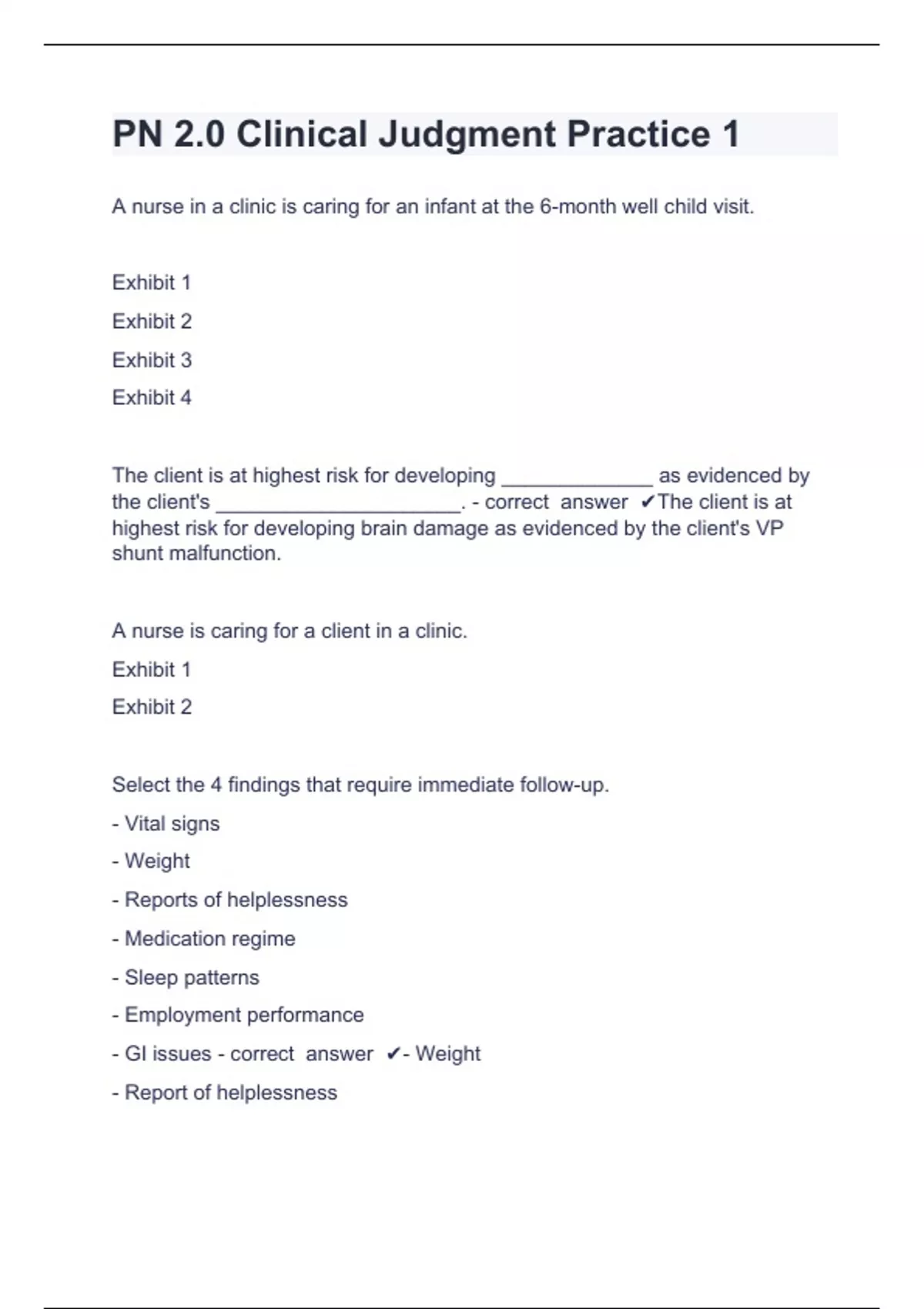 PN Question and answers rated A+PN 2.0 Clinical Judgment Practice 1 A nurse in a clinic is caring for an infant at the 6-month well child visit. Exhibit 1 Exhibit 2 Exhibit 3 Exhibit 4 The client is at highest risk for developing _____________ as evidenced by the client's _____________________. - correct answer The client is at highest risk for developing brain damage as evidenced by the client's VP shunt malfunction. A nurse is caring for a client in a clinic. Exhibit 1 Exhibit 2 Select the 4 findings that require immediate follow-up. - Vital signs - Weight - Reports of helplessness - Medication regime - Sleep patterns - Employment performance - GI issues - correct answer - Weight - Report of helplessn