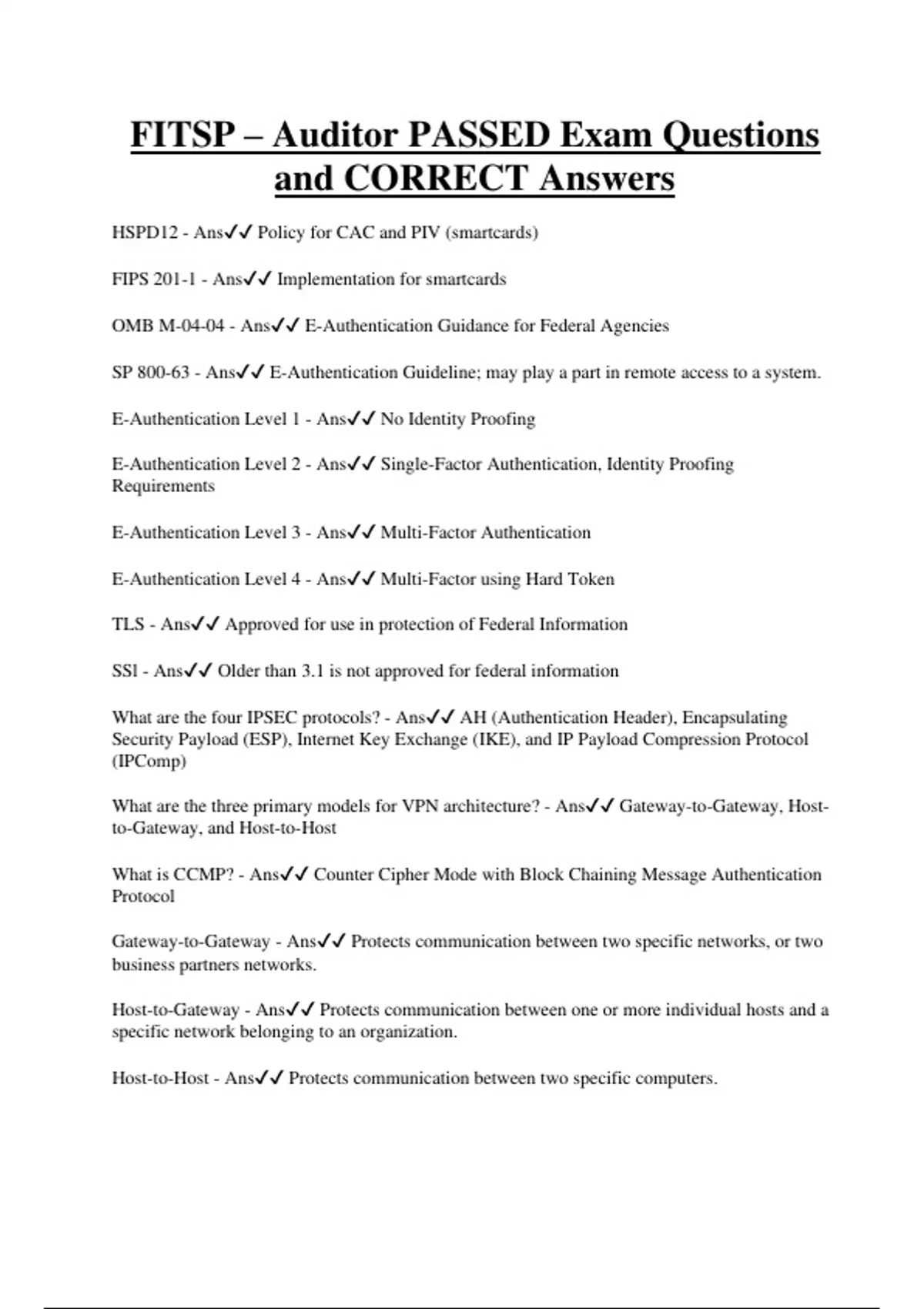 FITSP – Auditor PASSED Exam Questions and CORRECT Answers HSPD12 - Ans Policy for CAC and PIV (smartcards) FIPS 201-1 - Ans Implementation for smartcards OMB M-04-04 - Ans E-Authentication Guidance for Federal Agencies SP 800-63 - Ans E-Authentication Guideline; may play a part in remote access to a system. E-Authentication Level 1 - Ans No Identity Proofing