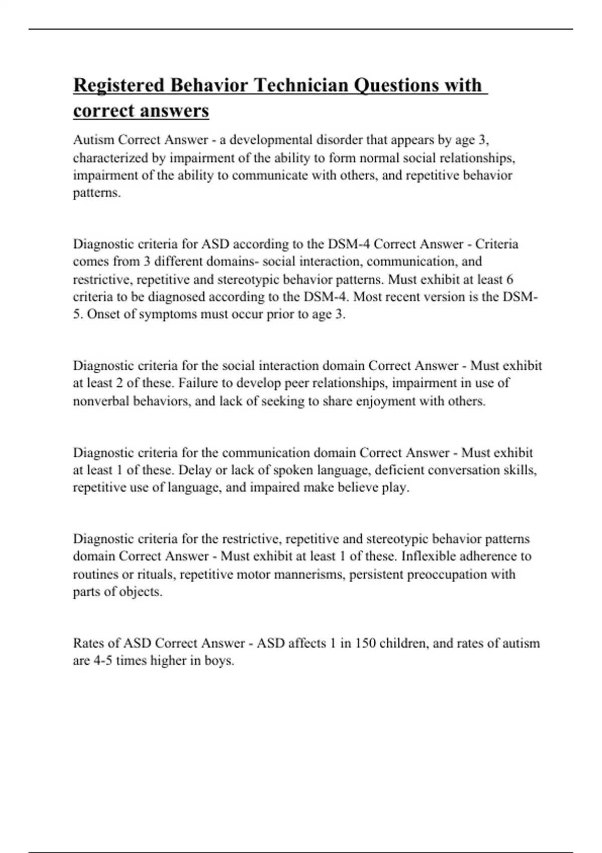 Autism Correct Answer - a developmental disorder that appears by age 3, characterized by impairment of the ability to form normal social relationships, impairment of the ability to communicate with others, and repetitive behavior patterns. Diagnostic criteria for ASD according to the DSM-4 Correct Answer - Criteria comes from 3 different domains- social interaction, communication, and restrictive, repetitive and stereotypic behavior patterns. Must exhibit at least 6 criteria to be diagnosed according to the DSM-4. Most recent version is the DSM-5. Onset of symptoms must occur prior to age 3. Diagnostic criteria for the social interaction domain Correct Answer - Must exhibit at least 2 of these. Failure to develop peer relationships, impairment in use of nonverbal behaviors, and lack of seeking to share enjoyment with others. Diagnostic criteria for the communication domain Correct Answer - Must exhibit at least 1 of these. Delay or lack of spoken language, deficient conversation skills, repetitive use of language, and impaired make believe play. Diagnostic criteria for the restrictive, repetitive and stereotypic behavior patterns domain Correct Answer - Must exhibit at least 1 of these. Inflexible adherence to routines or rituals, repetitive motor mannerisms, persistent preoccupation with parts of objects. Rates of ASD Correct Answer - ASD affects 1 in 150 children, and rates of autism are 4-5 times higher in boys.