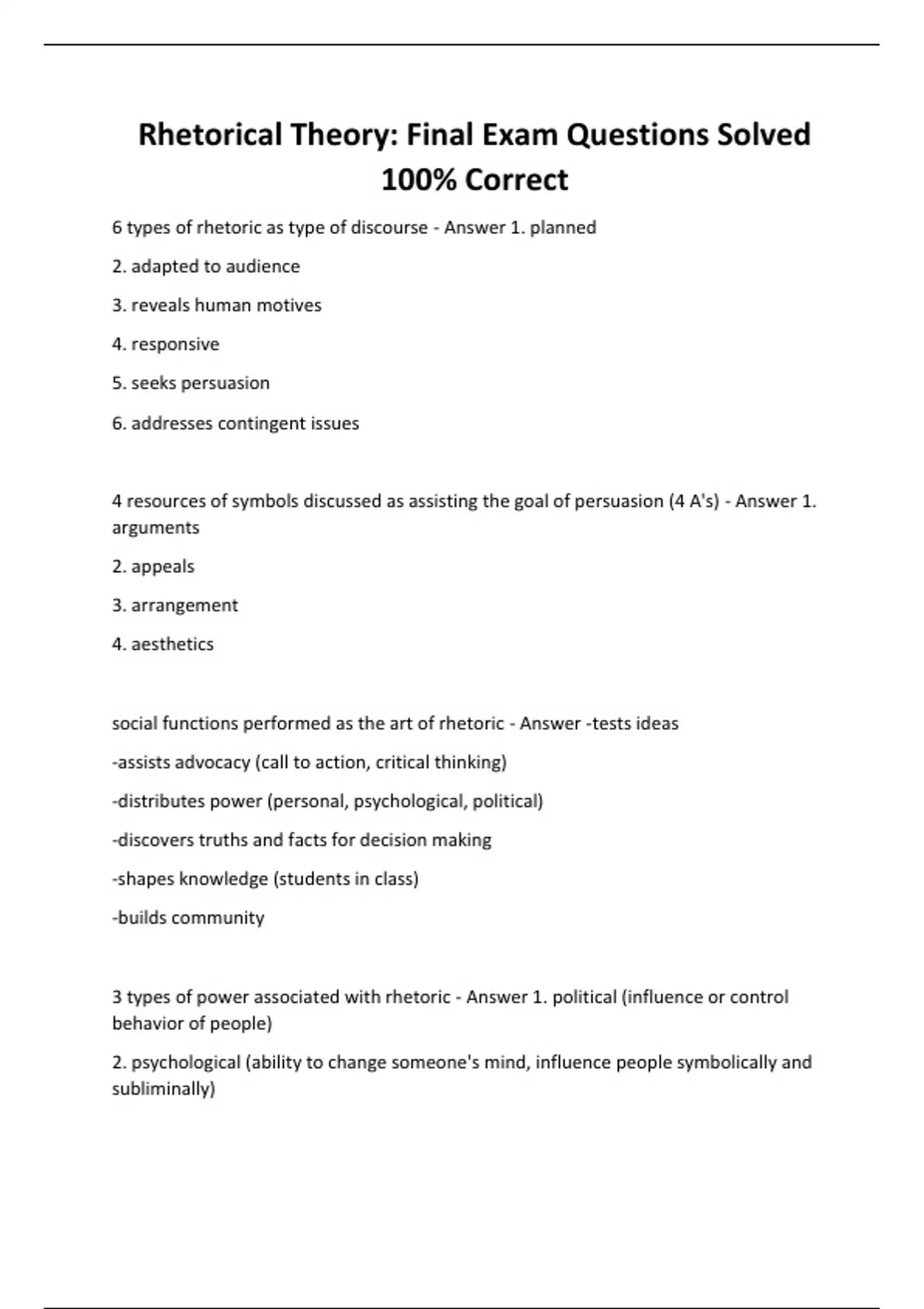 Rhetorical Theory: Final Exam Questions Solved 100% Correct