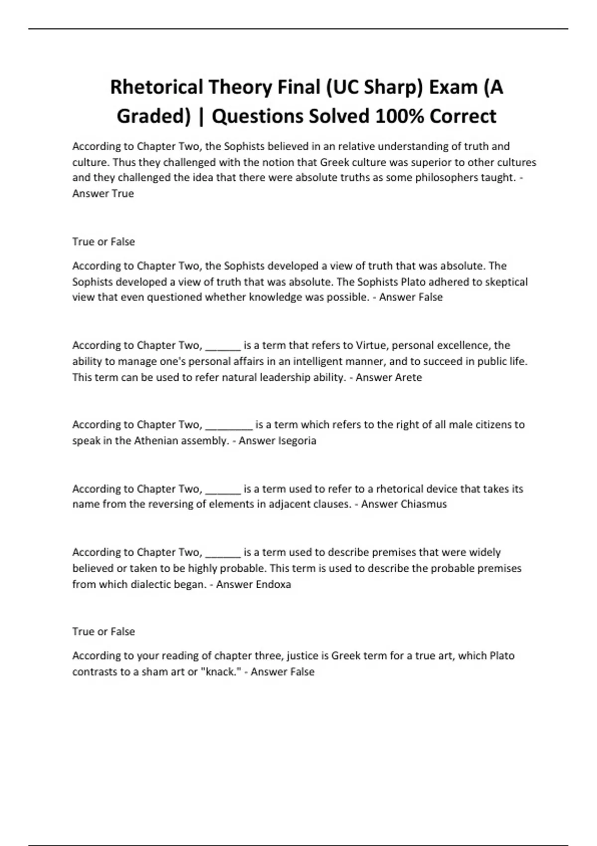 Rhetorical Theory Final (UC Sharp) Exam (A Graded) | Questions Solved 100% Correct