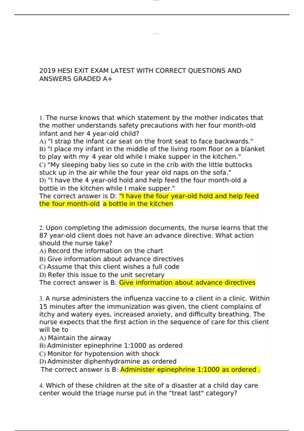 2019 HESI EXIT EXAM LATEST WITH CORRECT QUESTIONS AND ANSWERS GRADED A+