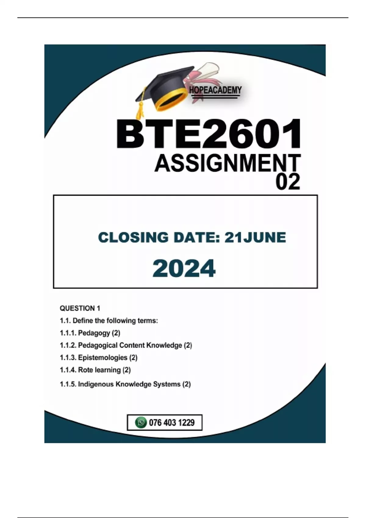 BTE2601 ASSIGNMENT 02..CLOSING DATE: 21 June 2024 QUESTION 1 1.1. Define the following terms: 1.1.1. Pedagogy (2)