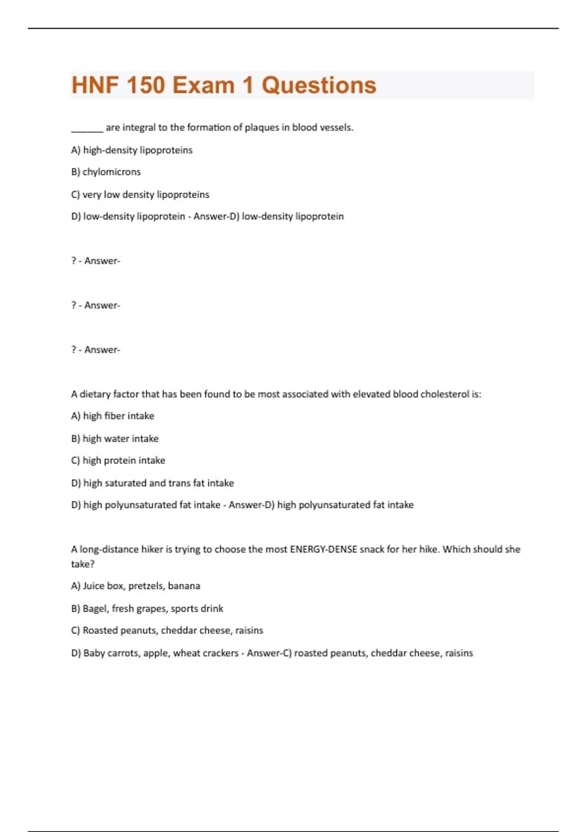 ______ are integral to the formation of plaques in blood vessels. A) high-density lipoproteins B) chylomicrons C) very low density lipoproteins D) low-density lipoprotein - Answer-D) low-density lipoprotein ? - Answer- ? - Answer- ? - AnswerA dietary factor that has been found to be most associated with elevated blood cholesterol is: A) high fiber intake B) high water intake C) high protein intake D) high saturated and trans fat intake D) high polyunsaturated fat intake - Answer-D) high polyunsaturated fat intake A long-distance hiker is trying to choose the most ENERGY-DENSE snack for her hike. Which should she take? A) Juice box, pretzels, banana B) Bagel, fresh grapes, sports drink C) Roasted peanuts, cheddar cheese, raisins D) Baby carrots, apple, wheat crackers - Answer-C) roasted peanuts, cheddar cheese, raisinsA woman how is pregnant is concerned about eating fish because of its potential contamination with mercury. What would you tell her? A) margarines and vegetable oils are excellent sources of alpha linolenic acid B) she needs to increase her intake of omega-6 fatty acids to provide protection from heart disease C) she can select fish species that provide EPA and DHA are low in mercury such as Alaskan salmon, sardines, or trout D) she can eat plant foods with high omega-6 fatty acid content because it can be converted to omega-3 fatty acids - Answer-C) she can select fish species that provide EPA and DHA are low in mercury such as Alaskan salmon, sardines, or trout According to Cara Ludlow, our guest lecturer, the definition of binge or high risk drinking is: A) 5 or more drinks for men and 4 or more drinks for women in 2 hours B) 3 or more drinks in 2 hours C) 6 or more drinks for men and 5 or more drinks for women in 2 hours D) 2 or more drinks in 1 hours - Answer-? All of the following foods contain healthy fatty acids EXCEPT: A) sunflower seeds, which are high in omega-6 fatty acids B) coconut oil, which is high in saturated fats C) flaxseeds, which are high in omega-3 fatty acids D) olives, which are high in monounsaturated fats - Answer-B) coconut oil, which is high in saturated fats Approximately what percent calories from carbohydrates would be provided by a meal containing 800 calories and 100 grams of carbohydrates? A) 44% B) 50% C) 17% D) 10% - Answer-B) 50% Carbohydrate and protein each provide _____ calories per gram.A) 2 B) 4 C) 7 D) 9 - Answer-B) 4