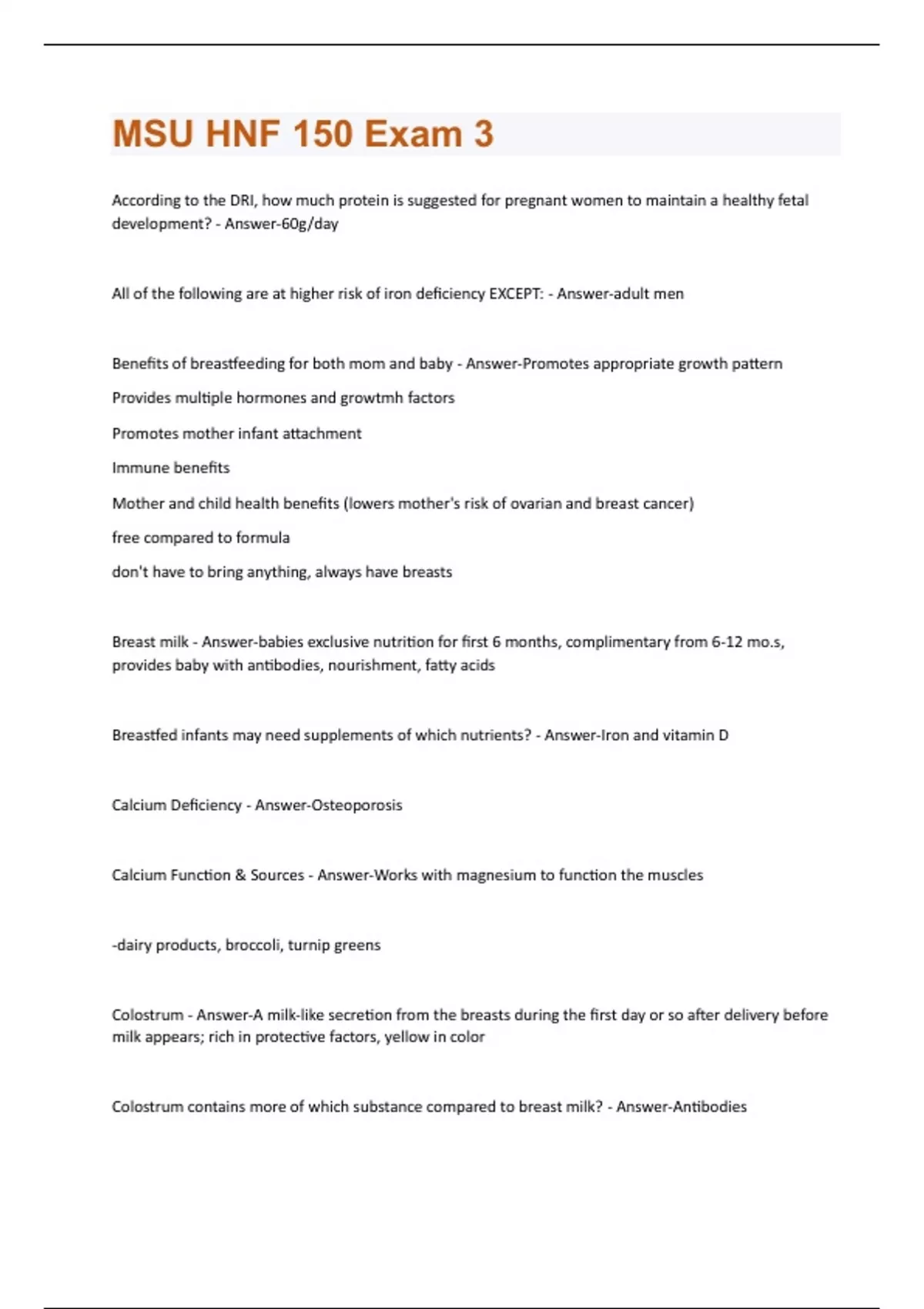 According to the DRI, how much protein is suggested for pregnant women to maintain a healthy fetal development? - Answer-60g/day All of the following are at higher risk of iron deficiency EXCEPT: - Answer-adult men Benefits of breastfeeding for both mom and baby - Answer-Promotes appropriate growth pattern Provides multiple hormones and growtmh factors Promotes mother infant attachment Immune benefits Mother and child health benefits (lowers mother's risk of ovarian and breast cancer) free compared to formula don't have to bring anything, always have breasts Breast milk - Answer-babies exclusive nutrition for first 6 months, complimentary from 6-12 mo.s, provides baby with antibodies, nourishment, fatty acids Breastfed infants may need supplements of which nutrients? - Answer-Iron and vitamin D Calcium Deficiency - Answer-Osteoporosis Calcium Function & Sources - Answer-Works with magnesium to function the muscles -dairy products, broccoli, turnip greens Colostrum - Answer-A milk-like secretion from the breasts during the first day or so after delivery before milk appears; rich in protective factors, yellow in color Colostrum contains more of which substance compared to breast milk? - Answer-AntibodiesDehydration symptoms - Answer--Thirst -Dry mouth -Lack of energy -Rapid pulse -Low blood pressure -Sudden weight loss -Reduced urine Diuretic - Answer-compound, usually a medication, causing increased urinary water excretion Fluoride Deficiency - Answer-dental decay Fluoride Function & Sources - Answer-Works with insulin to regulate/release energy from glucose. Helps form bones and teeth -fish, meat, seafood, water with fluoride Hard water: - Answer-contains dissolved minerals like calcium and magnesium Heme iron can only be found in which food sources? - Answer-Meat, fish, poultry How to dehydrate the body - Answer--Dont drink enough fluids -Diuretics (alcohol, caffeine) -Eat lots of salt and sugar Hunger: - Answer-fussing, crying, squirming, sucks fistInfant Feeding and Toddler Feeding Recommendations 0-6 months - Answer-only breastmilk or infant formula. Infant Feeding and Toddler Feeding Recommendations 10-12 months - Answer-breast milk/formula (3 servings), breads and cereals (4 servings), fruits (2 servings), vegetables (3 servings), meat, fish, poultry, eggs, or legumes (2 servings). Infant Feeding and Toddler Feeding Recommendations 6-7 months - Answer-start with new food on a spoon, make sure the baby is developmentally ready and interested in complementary foods, breast milk/formula still staple food. Infant Feeding and Toddler Feeding Recommendations 8-10 months - Answer-begin finger foods, slowly introduce meats, fish, casseroles, cheese, eggs, legumes, yogurt, diluted juice. Iodine Deficiency - Answer-goiter, cretinism(severe stomach bulge and underdevelopment mentally and physically) Iodine Function & Sources - Answer-Thyroid hormone and BMR -iodized salt, seafood, foods grown in iodine rich soil, bread Ions - Answer-electrically charged particles such as sodium or chloride Iron Deficiency - Answer-anemia, pica Iron Function & Sources - Answer-Oxygen carrying cells: hemoglobin ---> red blood cells--->myoglobin---- >muscle cells, helps enzymes use oxygen needed to make new cells