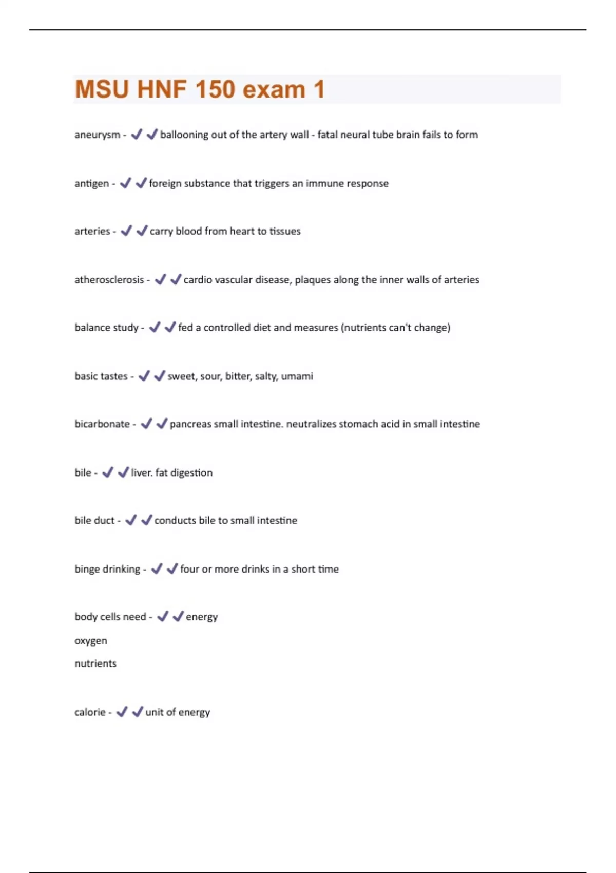 aneurysm - ballooning out of the artery wall - fatal neural tube brain fails to form antigen - foreign substance that triggers an immune response arteries - carry blood from heart to tissues atherosclerosis - cardio vascular disease, plaques along the inner walls of arteries balance study - fed a controlled diet and measures (nutrients can't change) basic tastes - sweet, sour, bitter, salty, umami bicarbonate - pancreas small intestine. neutralizes stomach acid in small intestine bile - liver. fat digestion bile duct - conducts bile to small intestine binge drinking - four or more drinks in a short time body cells need - energy oxygen nutrients calorie - unit of energycarbs in liver - 1. glucose form starch and simple sugars used for energy, glycogen,fat,in blood 2. fructose-simple sugars case control study retrospective - identifying cases and comparing the controls(without the disease/condition) case study - studies individuals causes type 1 - genetics, viral infection, toxins, disordered immune system causes type 2 - genetics, fatness, lifestyle