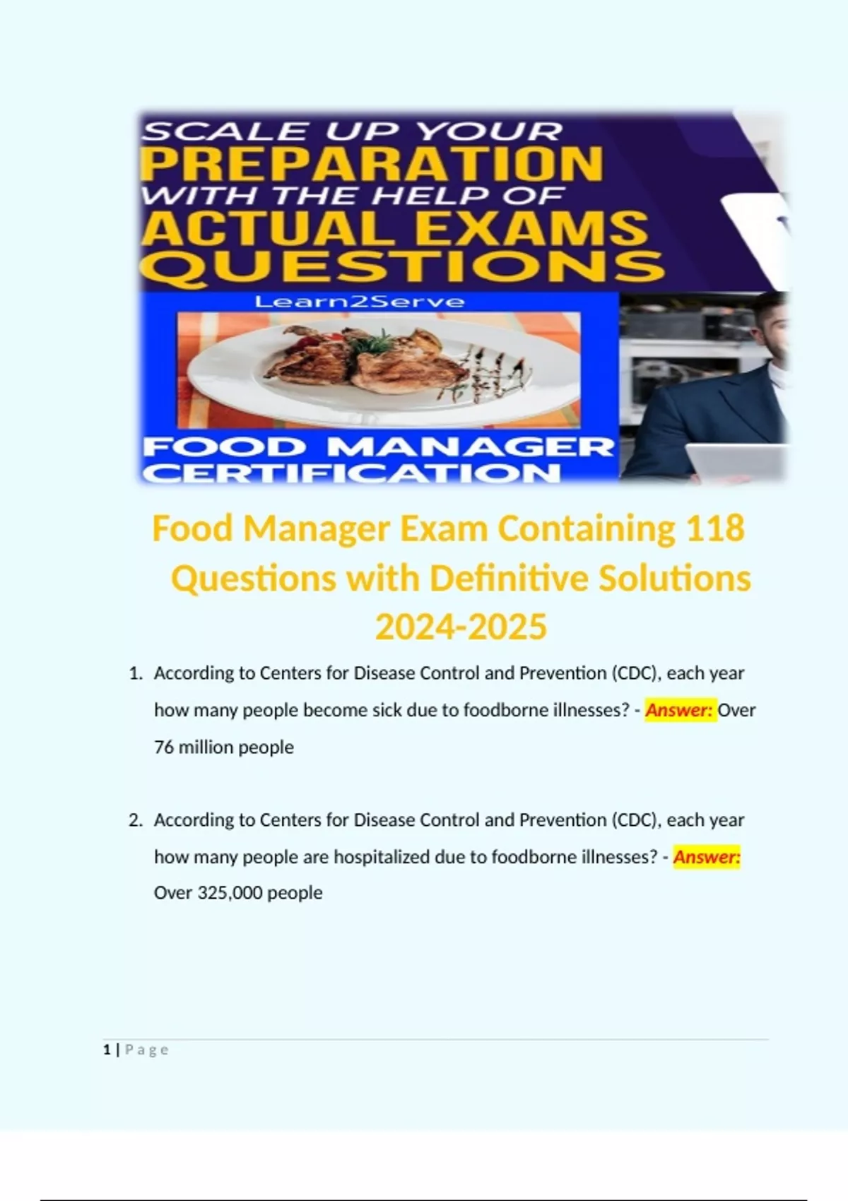 Food Manager Exam Containing 118 Questions with Definitive Solutions Terms like: 1. According to Centers for Disease Control and Prevention (CDC), each year how many people become sick due to foodborne illnesses? - Answer: Over 76 million people 2. According to Centers for Disease Control and Prevention (CDC), each year how many people are hospitalized due to foodborne illnesses? - Answer: Over 325,000 people