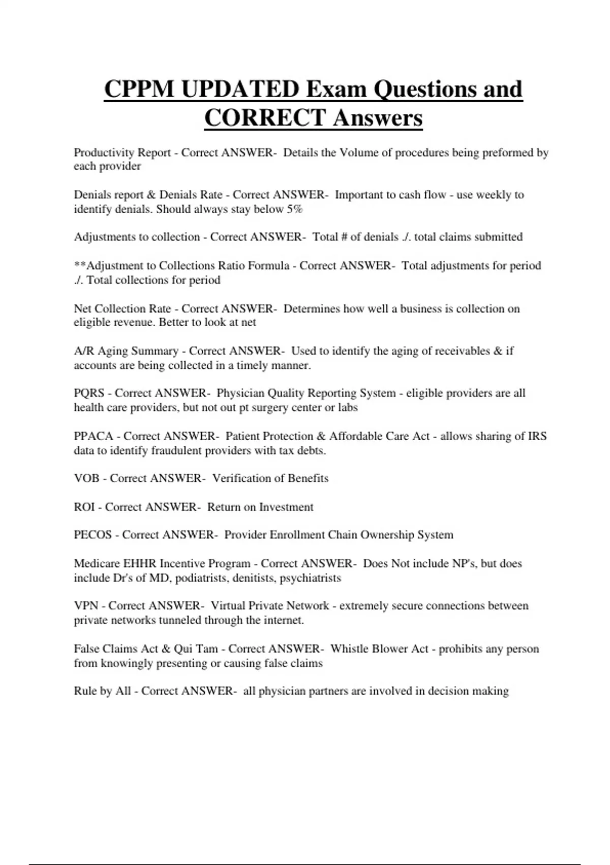 CPPM UPDATED Exam Questions and CORRECT Answers Productivity Report - Correct ANSWER- Details the Volume of procedures being preformed by each provider Denials report & Denials Rate - Correct ANSWER- Important to cash flow - use weekly to identify denials. Should always stay below 5% Adjustments to collection - Correct ANSWER- Total # of denials ./. total claims submitted **Adjustment to Collections Ratio Formula - Correct ANSWER- Total adjustments for period ./. Total collections for period