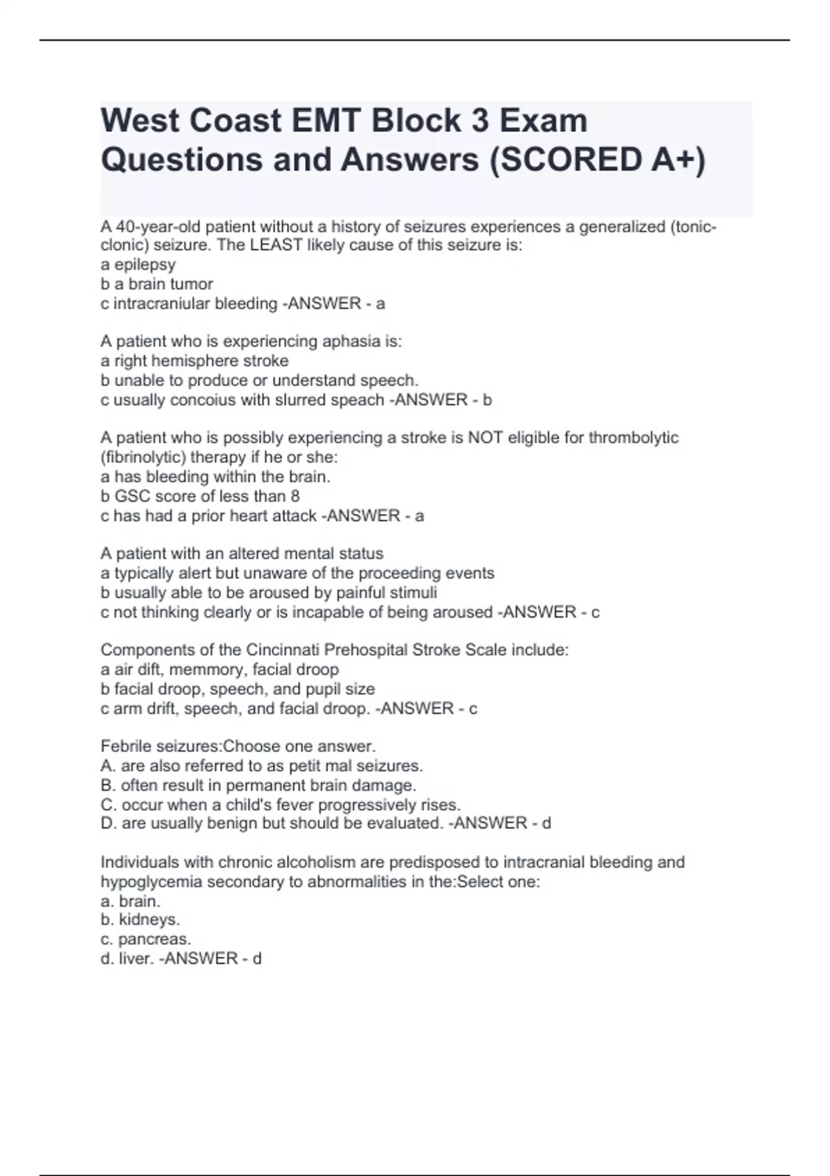 A 40-year-old patient without a history of seizures experiences a generalized (tonic-clonic) seizure. The LEAST likely cause of this seizure is: a epilepsy b a brain tumor c intracraniular bleeding -ANSWER - a A patient who is experiencing aphasia is: a right hemisphere stroke b unable to produce or understand speech. c usually concoius with slurred speach -ANSWER - b A patient who is possibly experiencing a stroke is NOT eligible for thrombolytic (fibrinolytic) therapy if he or she: a has bleeding within the brain. b GSC score of less than 8 c has had a prior heart attack -ANSWER - a A patient with an altered mental status a typically alert but unaware of the proceeding events b usually able to be aroused by painful stimuli c not thinking clearly or is incapable of being aroused -ANSWER - c Components of the Cincinnati Prehospital Stroke Scale include: a air dift, memmory, facial droop b facial droop, speech, and pupil size c arm drift, speech, and facial droop. -ANSWER - c Febrile seizures:Choose one answer. A. are also referred to as petit mal seizures. B. often result in permanent brain damage. C. occur when a child's fever progressively rises. D. are usually benign but should be evaluated. -ANSWER - d Individuals with chronic alcoholism are predisposed to intracranial bleeding and hypoglycemia secondary to