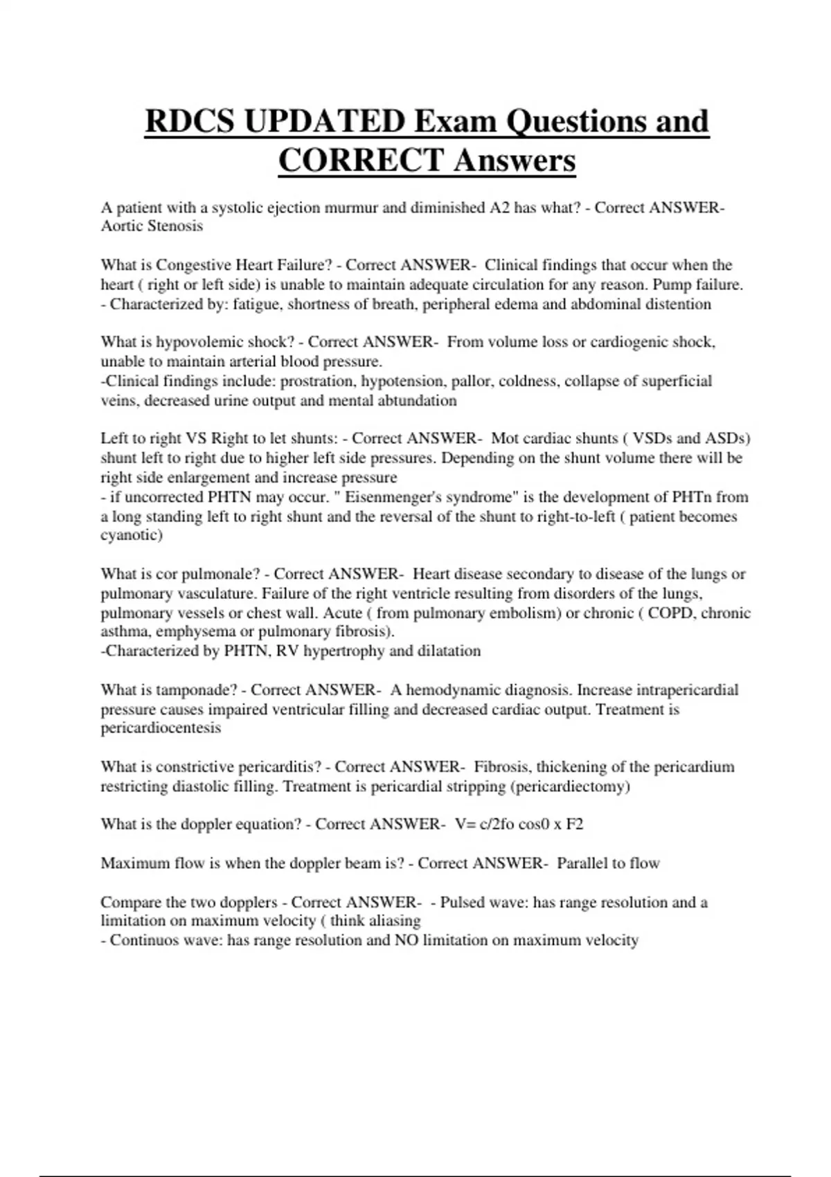 RDCS UPDATED Exam Questions and CORRECT Answers A patient with a systolic ejection murmur and diminished A2 has what? - Correct ANSWERAortic Stenosis What is Congestive Heart Failure? - Correct ANSWER- Clinical findings that occur when the heart ( right or left side) is unable to maintain adequate circulation for any reason. Pump failure. - Characterized by: fatigue, shortness of breath, peripheral edema and abdominal distention What is hypovolemic shock? - Correct ANSWER- From volume loss or cardiogenic shock, unable to maintain arterial blood pressure. -Clinical findings include: prostration, hypotension, pallor, coldness, collapse of superficial veins, decreased urine output and mental abtundation