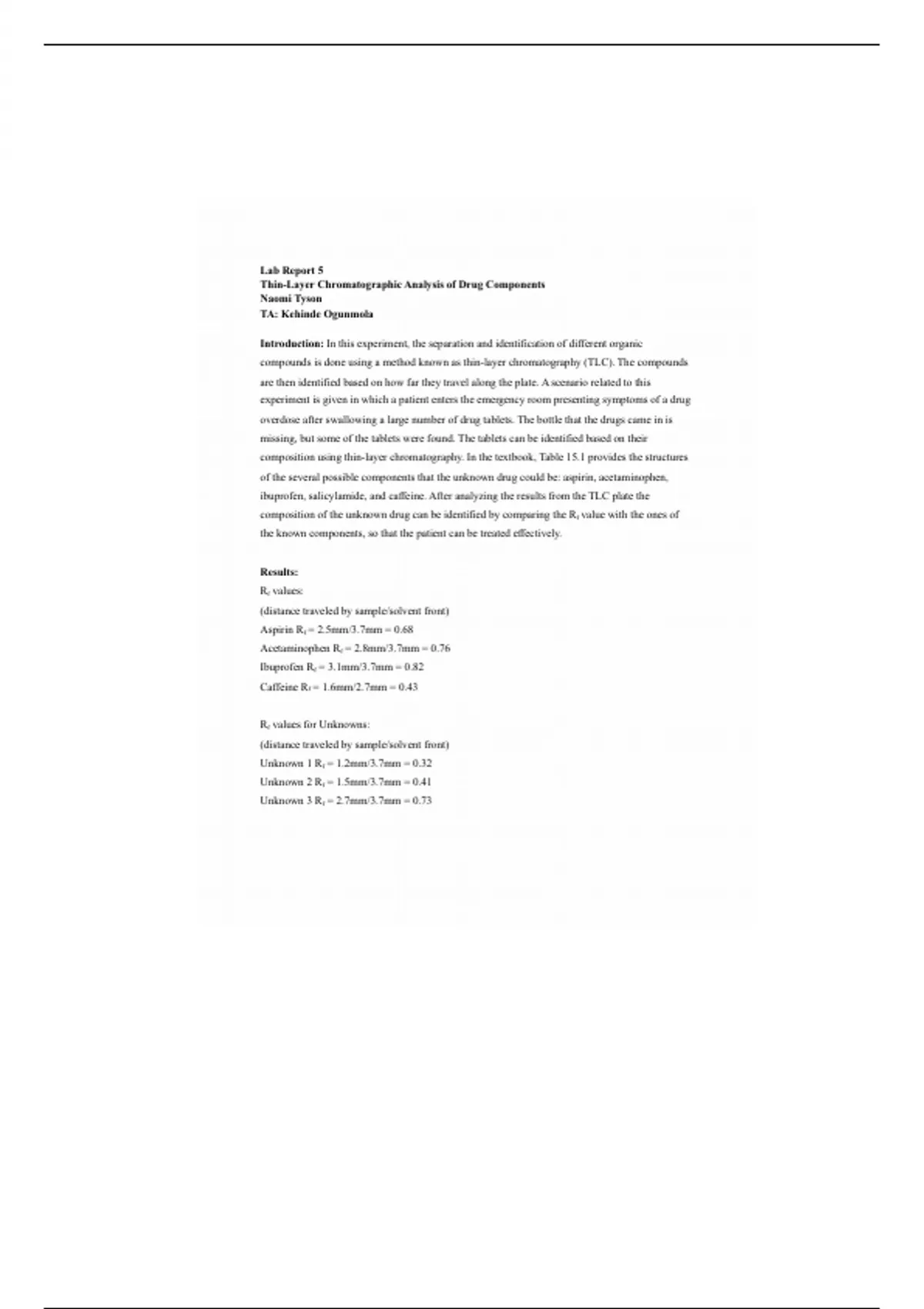 This is a comprehensive and detailed lab report on experiment 5; Thin- layer Chromatographic analysis of drug component. Quality stuff!!