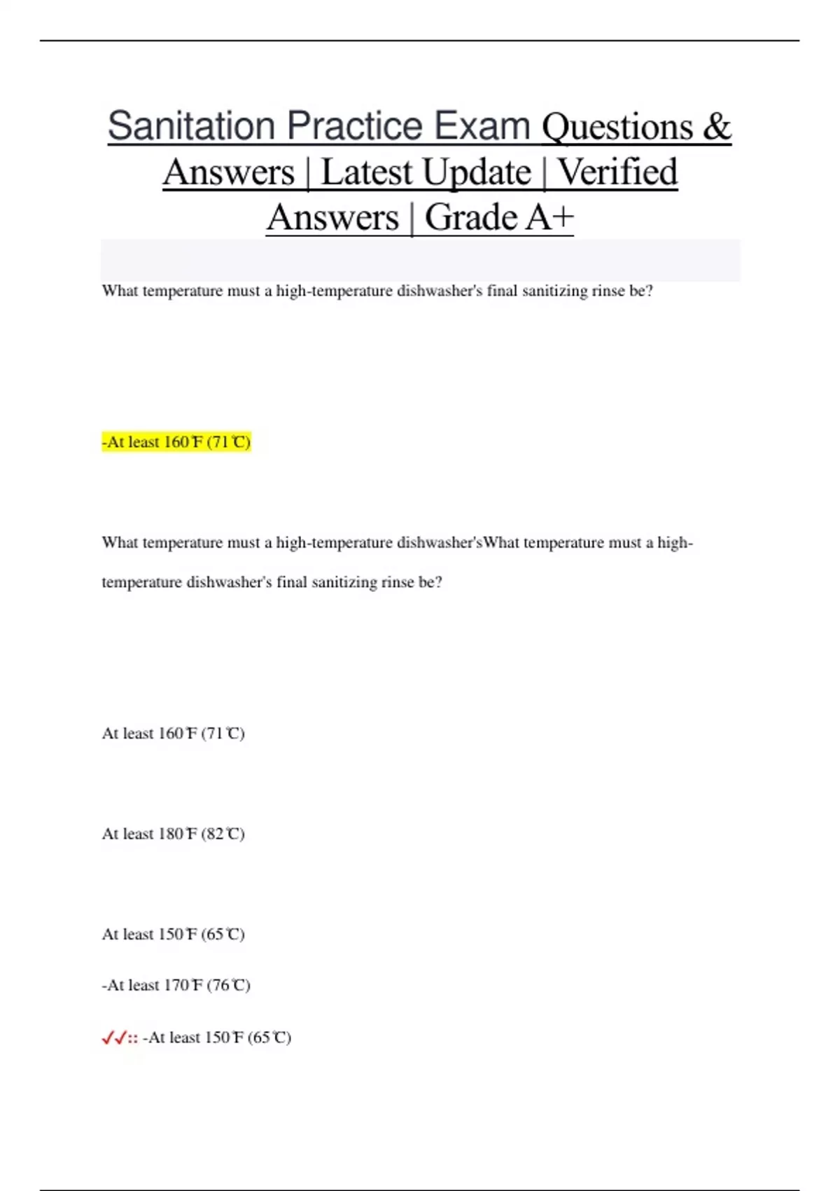 Sanitation Practice Exam Questions & Answers | Latest Update | Verified Answers | Grade A+