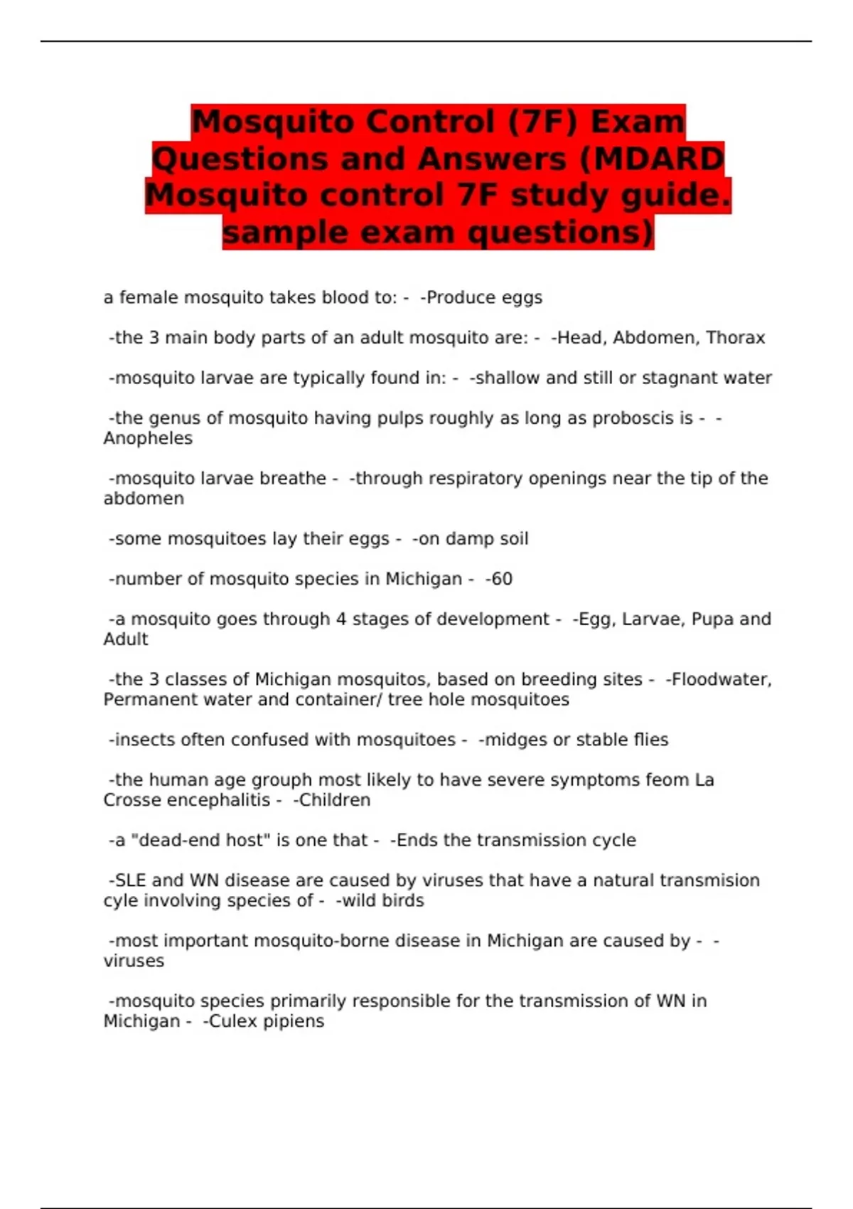 Mosquito Control (7F) Exam Questions and Answers (MDARD Mosquito control 7F study guide. sample exam questions)