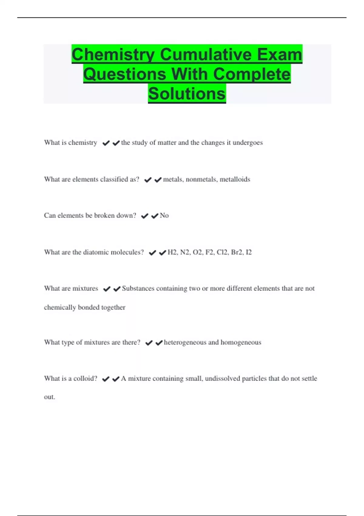 Chemistry Cumulative Exam Questions With Complete Solutions What is chemistry ️️the study of matter and the changes it undergoes What are elements classified as? ️️metals, nonmetals, metalloids Can elements be broken down? ️️No What are the diatomic molecules? ️️H2, N2, O2, F2, Cl2, Br2, I2 What are mixtures ️️Substances containing two or more different elements that are not chemically bonded together