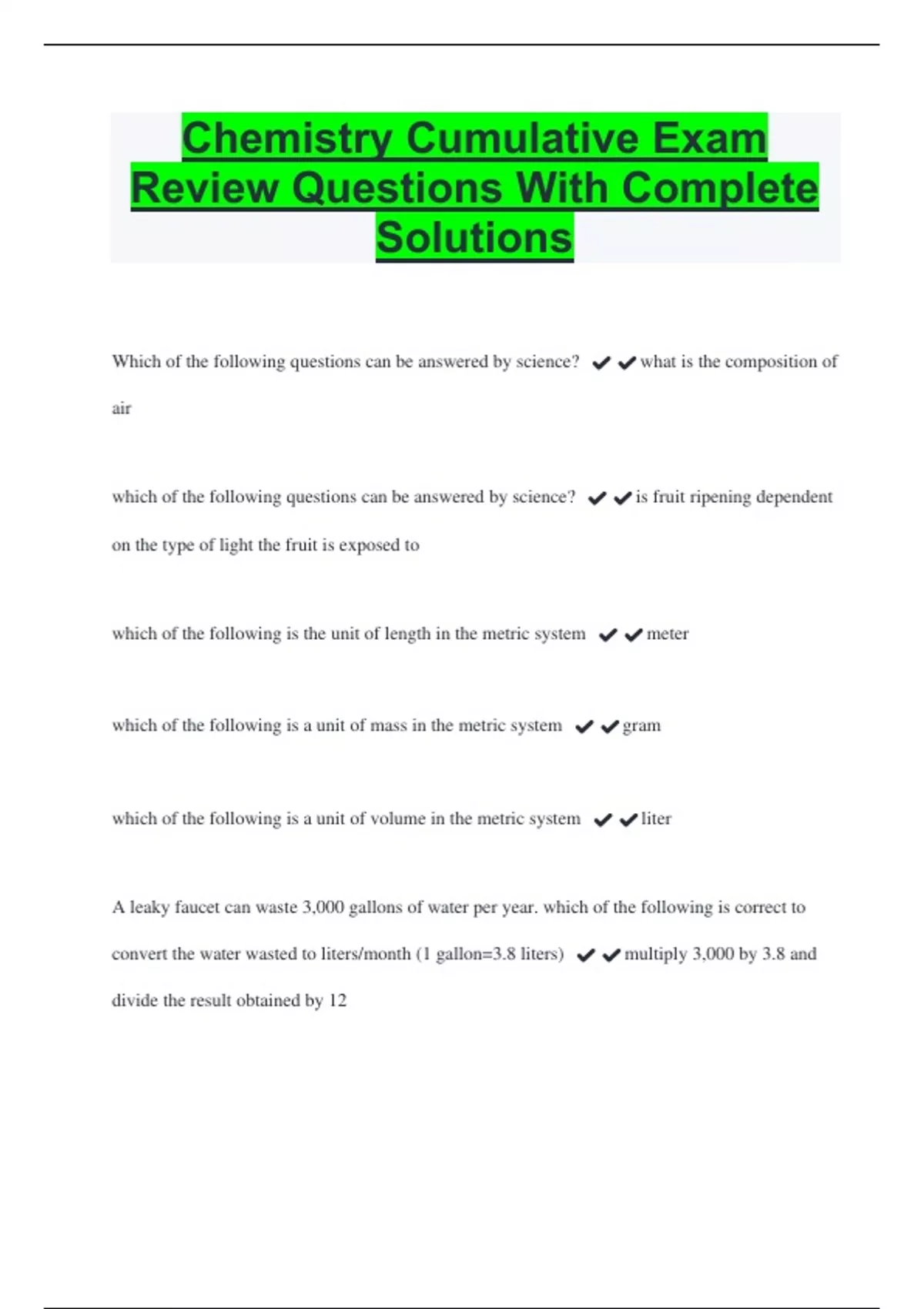 Chemistry Cumulative Exam Review Questions With Complete Solutions Which of the following questions can be answered by science? ️️what is the composition of air which of the following questions can be answered by science? ️️is fruit ripening dependent on the type of light the fruit is exposed to which of the following is the unit of length in the metric system ️️meter which of the following is a unit of mass in the metric system ️️gram