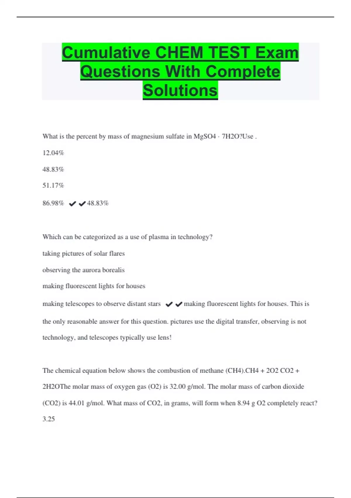 Cumulative CHEM TEST Exam Questions With Complete Solutions What is the percent by mass of magnesium sulfate in MgSO4 · 7H2O?Use . 12.04% 48.83% 51.17% 86.98% ️️48.83% Which can be categorized as a use of plasma in technology? taking pictures of solar flares observing the aurora borealis making fluorescent lights for houses making telescopes to observe distant stars ️️making fluorescent lights for houses. This is the only reasonable answer for this question. pictures use the digital transfer, observing is not technology, and telescopes typically use lens!