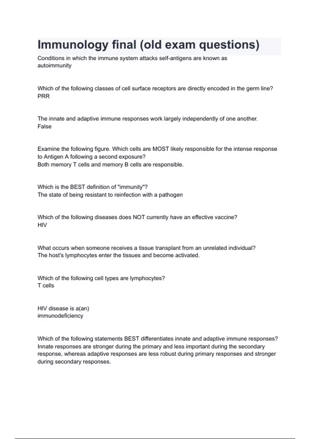 Immunology final (old exam questions) Questions with 100% Correct Answers Verified Latest Update 2024