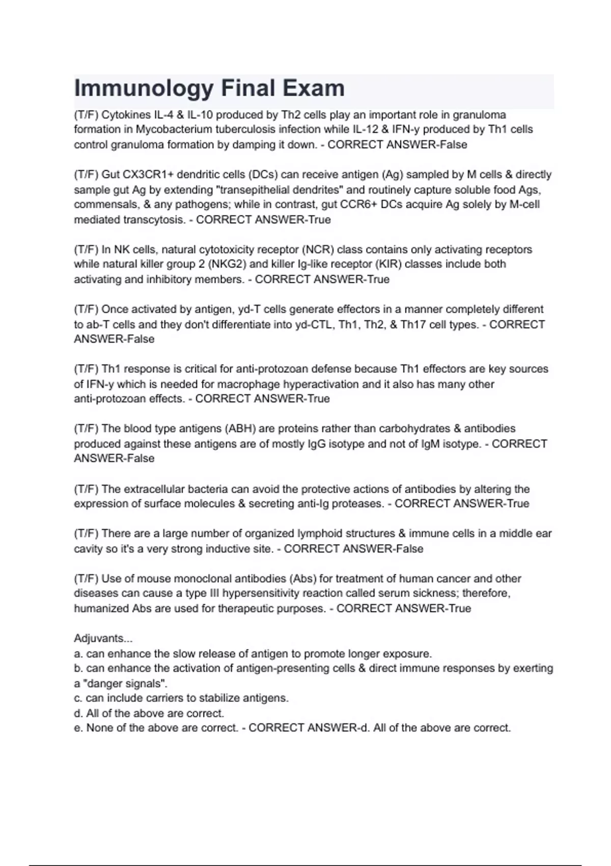 Immunology Final Exam Questions with 100% Correct Answers Verified Latest Update 2024.
