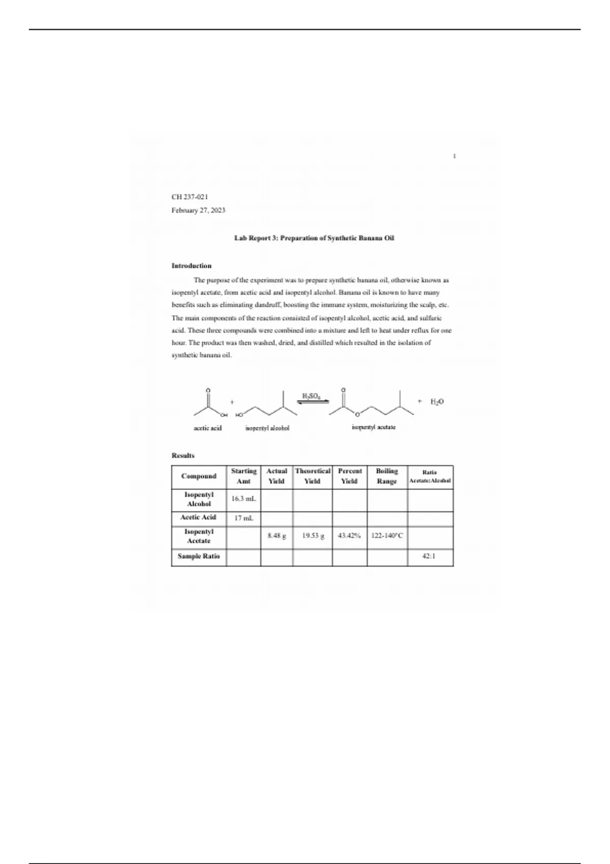 This is a comprehensive and detailed lab report on preparation of synthetic banana oil for CH 237. Quality stuff!!