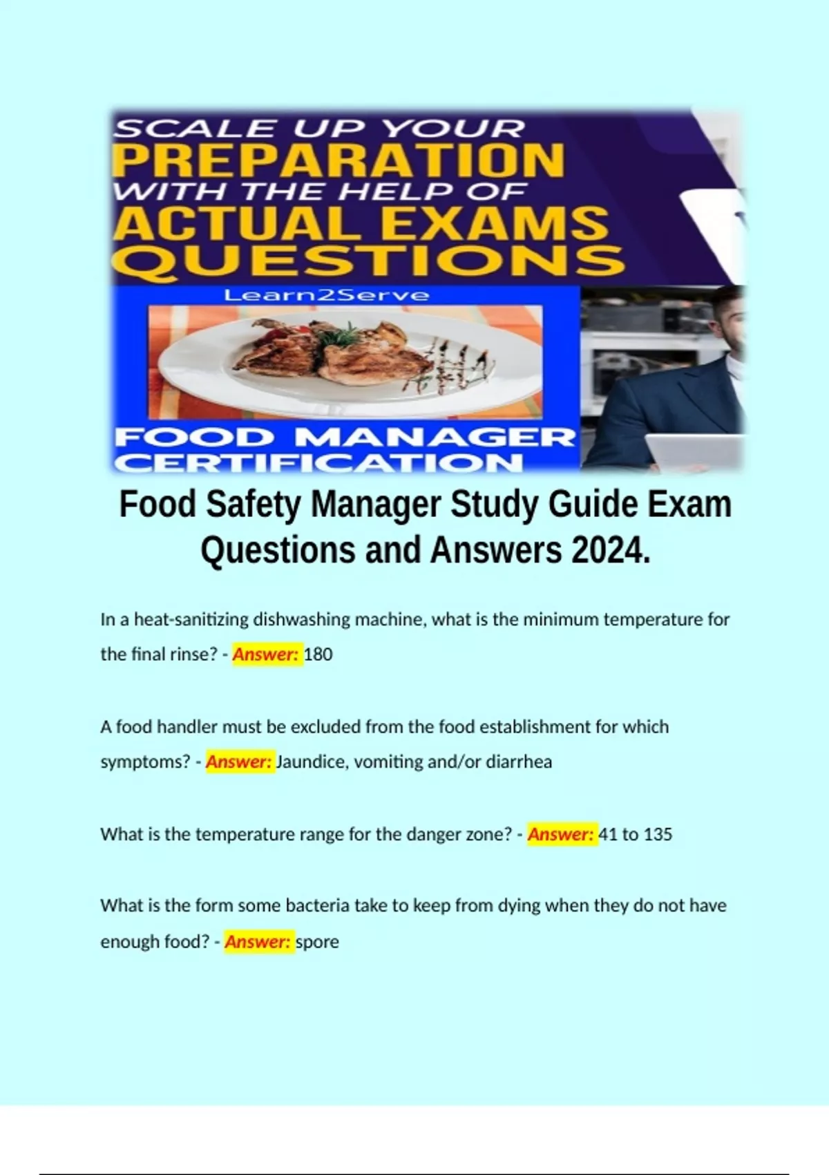 Food Safety Manager Study Guide Exam Questions and Answers 2024.