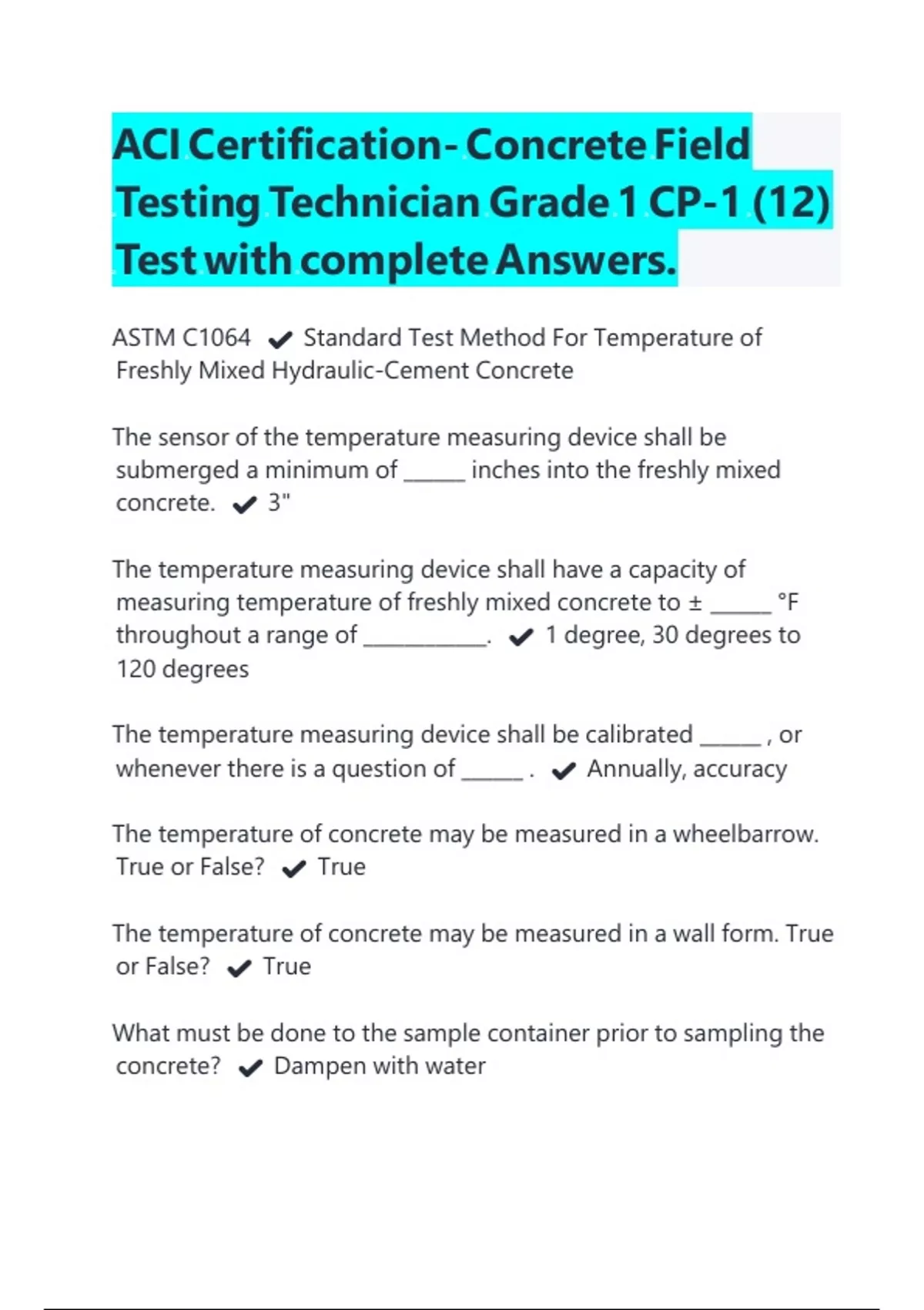 ACI Certification- Concrete Field Testing Technician Grade 1 CP-1 (12) Test with complete Answers.