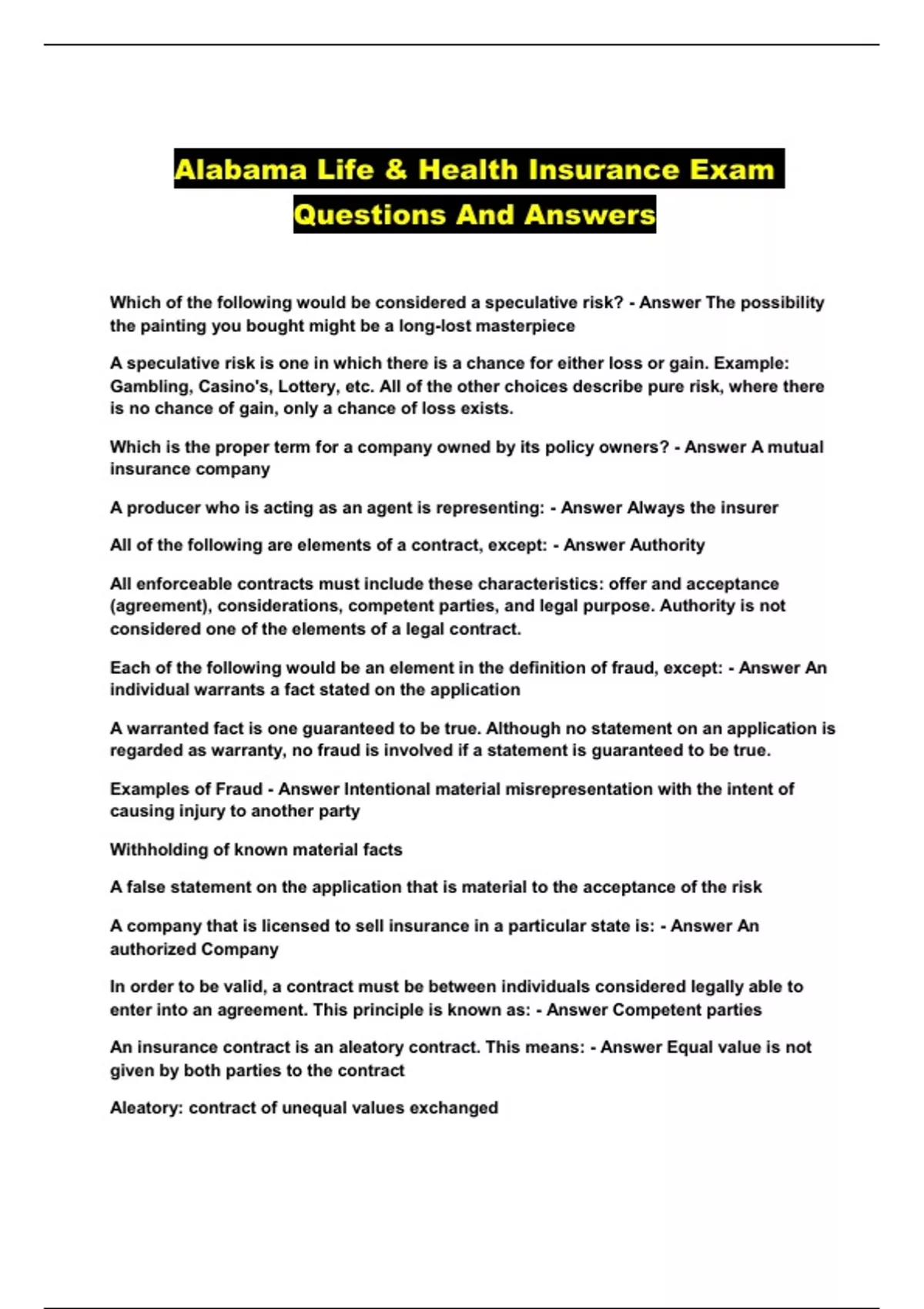 Alabama Life & Health Insurance Exam Questions And Answers...