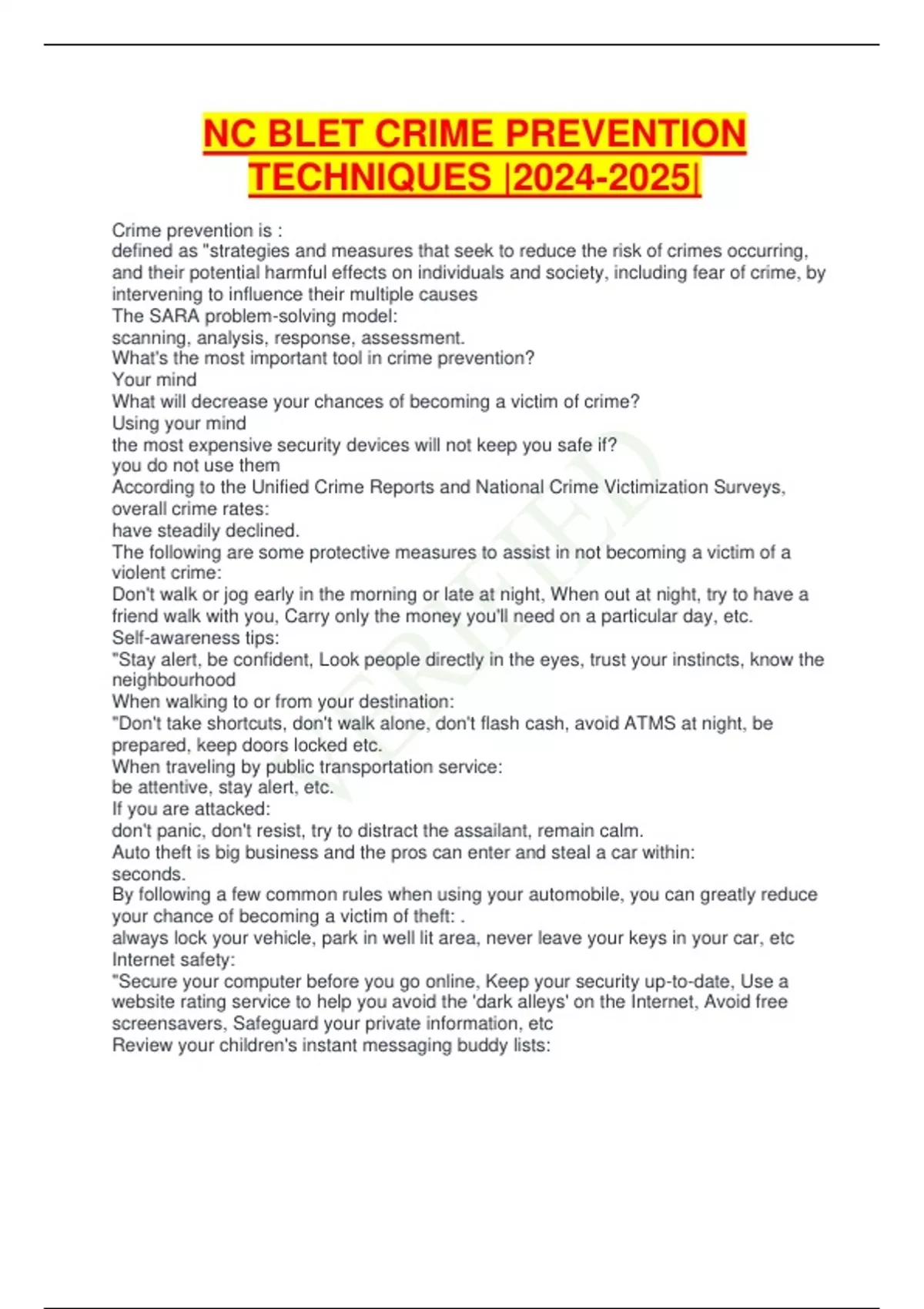 NC BLET CRIME PREVENTION TECHNIQUES || Crime prevention is : defined as "strategies and measures that seek to reduce the risk of crimes occurring, and their potential harmful effects on individuals and society, including fear of crime, by intervening to influence their multiple causes The SARA problem-solving model: scanning, analysis, response, assessment. What's the most important tool in crime prevention? Your mind What will decrease your chances of becoming a victim of crime? Using your mind the most expensive security devices will not keep you safe if? you do not use them According to the Unified Crime Reports and National Crime Victimization Surveys, overall crime rates: have steadily declined. The following are some protective measures to assist in not becoming a victim of a violent crime: Don't walk or jog early in the morning or late at night, When out at night, try to have a friend walk with you, Carry only the money you'll need on a particular day, etc. Self-awareness tips: "Stay alert, be confident, Look people directly in the eyes, trust your instincts, know the neighbourhood When walking to or from your destination: "Don't take shortcuts, don't walk alone, don't flash cash, avoid ATMS at night, be prepared, keep doors locked etc. When traveling by public transportation service: be attentive, stay alert, etc. If you are attacked: don't panic, don't resist, try to distract the assailant, remain calm. Auto theft is big business and the pros can enter and steal a car within: seconds. By following a few common rules when using your automobile, you can greatly reduce your chance of becoming a victim of theft: . always lock your vehicle, park in well lit area, never leave your keys in your car, etc Internet safety: "Secure your computer before you go online, Keep your security up-to-date, Use a website rating service to help you avoid the 'dark alleys' on the Internet, Avoid free screensavers, Safeguard your private information, etc Review your children's instant messaging buddy lists: . The last thing you want is to learn a sexual predator is exchanging messages with your kids. We owe it to them to protect them from these criminals. Both bullying and cyberbullying: can be extremely hurtful and damaging to a person. Things posted online are visible to the world: 24 hours a day seven days a week. Sometimes, the thieves aren't after money. They may use your identity to commit crimes like these: commit crimes using your identity, steal insurance info, etc. The recently enacted Fair and Accurate Credit Transactions Act requires that each of the three (3) major credit reporting agencies provide consumers with a free: credit report once a year. Three major credit agencies: Equifax, Experian, and TransUnion. Crime Prevention Techniques for Residential Homeowners: answer phones and doors so burglars know your home, never tell a caller your alone, look through the peephole to make sure you know the person outside your door etc. Home security checklist: make sure all doors are locked, make sure all windows are secured, make sure your outdoor area is secured, make sure your house is secured well when away from home, Millions of dollars of revenue are lost each year from crimes against: businesses. Physical security constitutes what percent of burglary prevention: 90 percent The following recommendations will help prevent burglaries: Locks on all outside entrances and inside security doors, entry doors should be solid, door jams must be solid, etc. Shoplifting prevention: remove the opportunity, employees should be aware of all customers, train employees to observe, neat store, etc. what are two (2) good ways to enlist customer support for your anti- shoplifting efforts: Enclosing pamphlets in shopping bags and posting shoplifting awareness signs There are many useful but sometimes-resisted procedures, which can dramatically reduce shoplifting losses: security bags, signs, mirrors, price tags, clothing hangers. Shoplifting tools: large empty purses, backpacks, bulky over clothing out of the weather season. Shoplifting methods, amateur or professional, can be broke