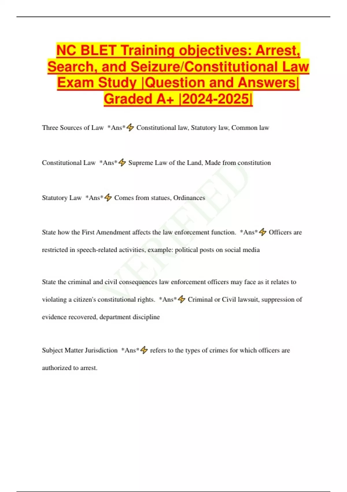 NC BLET Training objectives: Arrest, Search, and Seizure/Constitutional Law Exam Study |Question and Answers| Graded A+ ||