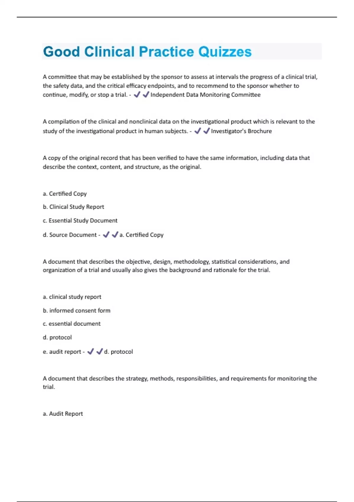 A committee that may be established by the sponsor to assess at intervals the progress of a clinical trial, the safety data, and the critical efficacy endpoints, and to recommend to the sponsor whether to continue, modify, or stop a trial. - Independent Data Monitoring Committee A compilation of the clinical and nonclinical data on the investigational product which is relevant to the study of the investigational product in human subjects. - Investigator's Brochure A copy of the original record that has been verified to have the same information, including data that describe the context, content, and structure, as the original. a. Certified Copy b. Clinical Study Report c. Essential Study Document d. Source Document - a. Certified Copy A document that describes the objective, design, methodology, statistical considerations, and organization of a trial and usually also gives the background and rationale for the trial. a. clinical study report b. informed consent form c. essential document d. protocol e. audit report - d. protocol A document that describes the strategy, methods, responsibilities, and requirements for monitoring the trial. a. Audit Reportb. Monitoring Report c. Clinical Development Plan d. Monitoring Plan - d. Monitoring Plan
